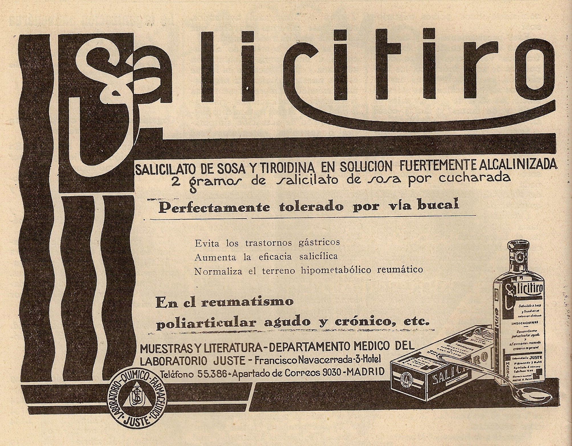 Salicitiro. Salicilato de tirodina en.solución perfectamente alcalinizada. La Medicina Íbera, 11 de abril de 1931.