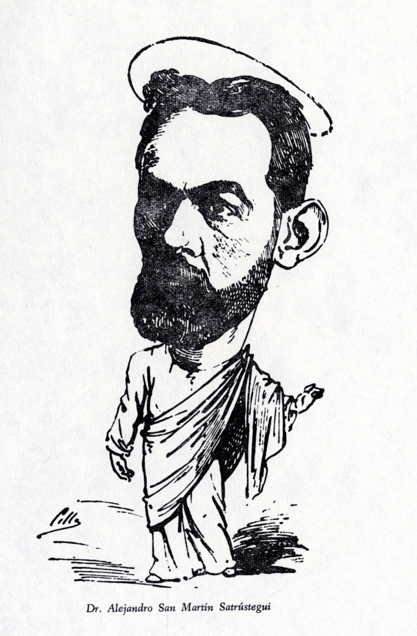 Caricatura del Dr. D. Alejandro San Martín Satrústegui (1847 – 1908) , por Cilla, sacada del libro del Prof. D. Luís Sánchez Granjel, ‘Biografía de “El Dr. Sangredo” (1883-1884)’, que fue una revista médica del siglo XIX que se subtitulaba “Revista satírica quincenal. Dedicada a los hijos de Esculapio”. Pag. 129.