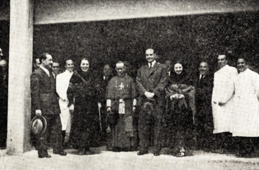 El Excmo. Sr. Ministro de la Gobernación y el ILmo. Sr. Obispo de Avila son recibidos a su entrada en el Sanatorio de Santa Teresa por el personal del mismo y dos enfermas ataviadas con traje regional. Consejo General de Colegios Médicos de España, 10, May. 1947