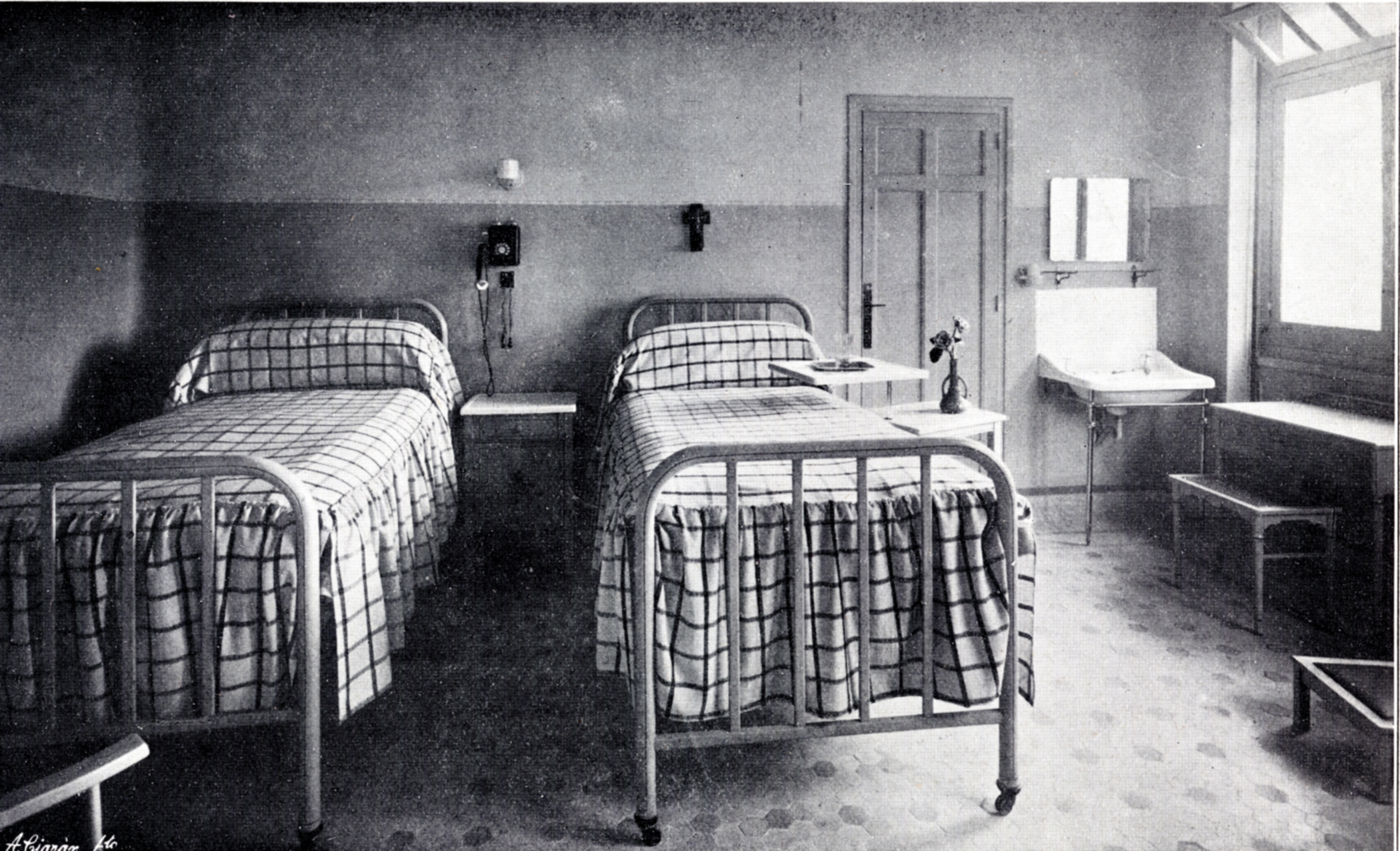 Sanatorio Santa Alicia, de Vital Aza, en Madrid. Primer Sanatorio Español. Campea en su instalación el sistema metálico americano , con tonos alegres y discretos en la decoración, huyendo del clásico blanco de hospital a la vieja usanza. Gaceta Médica Española, 27, Dec. 1928