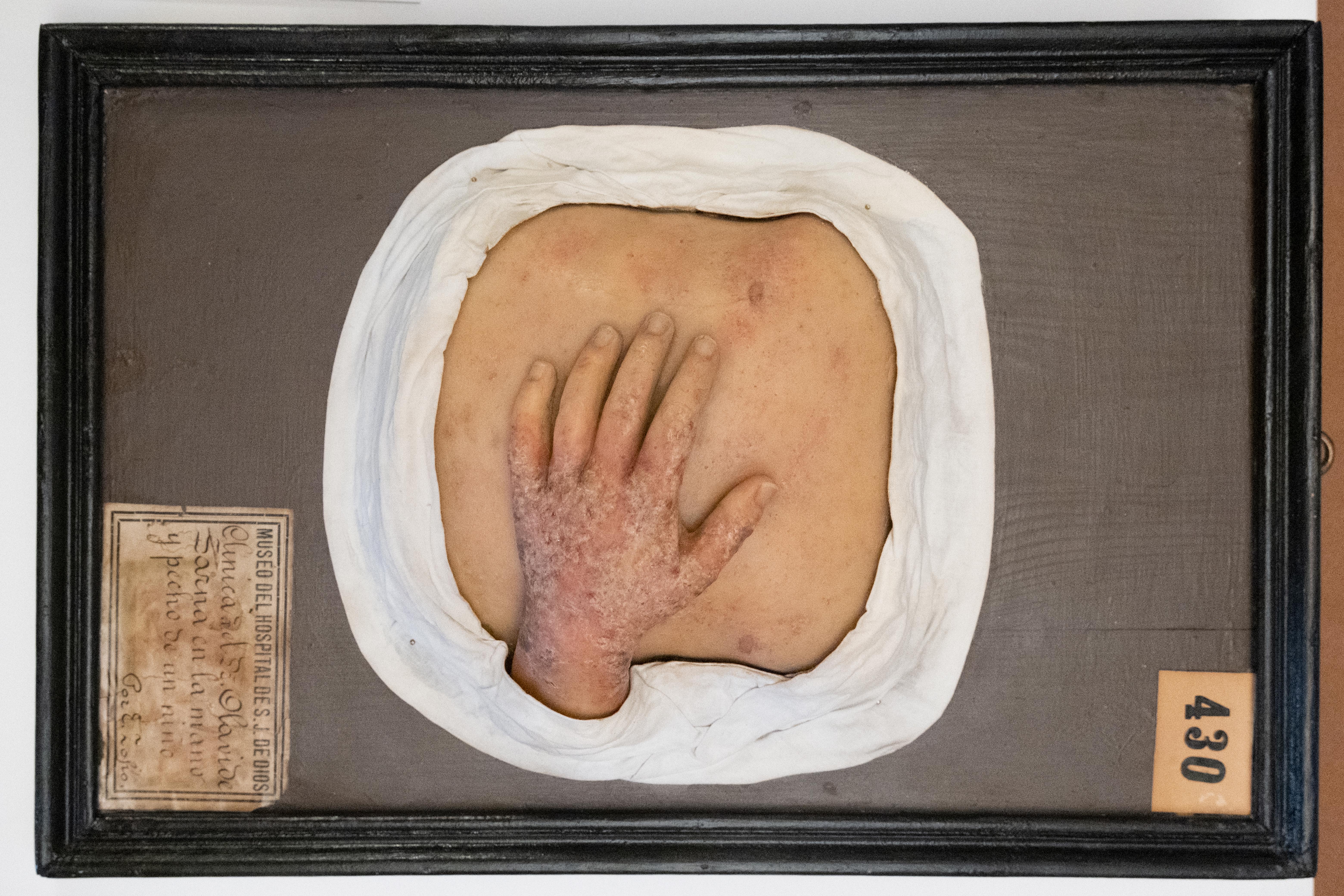 Sarna en la mano y pecho de un niño (Clínica Dr. Olavide) Moulage de cera enmarcado. 1879. Museo Olavide de la Academia Española de Dermatología y Venereología (AEDV).