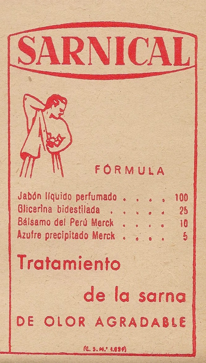Sarnical. Tratamiento de la sarna.. Jabón líquido, glicerina, bálsamo del Perú, azufre precipitado. Publicidad aparecida en Gaceta Médica Española. Noviembre 1953, año XXVII, número 11.