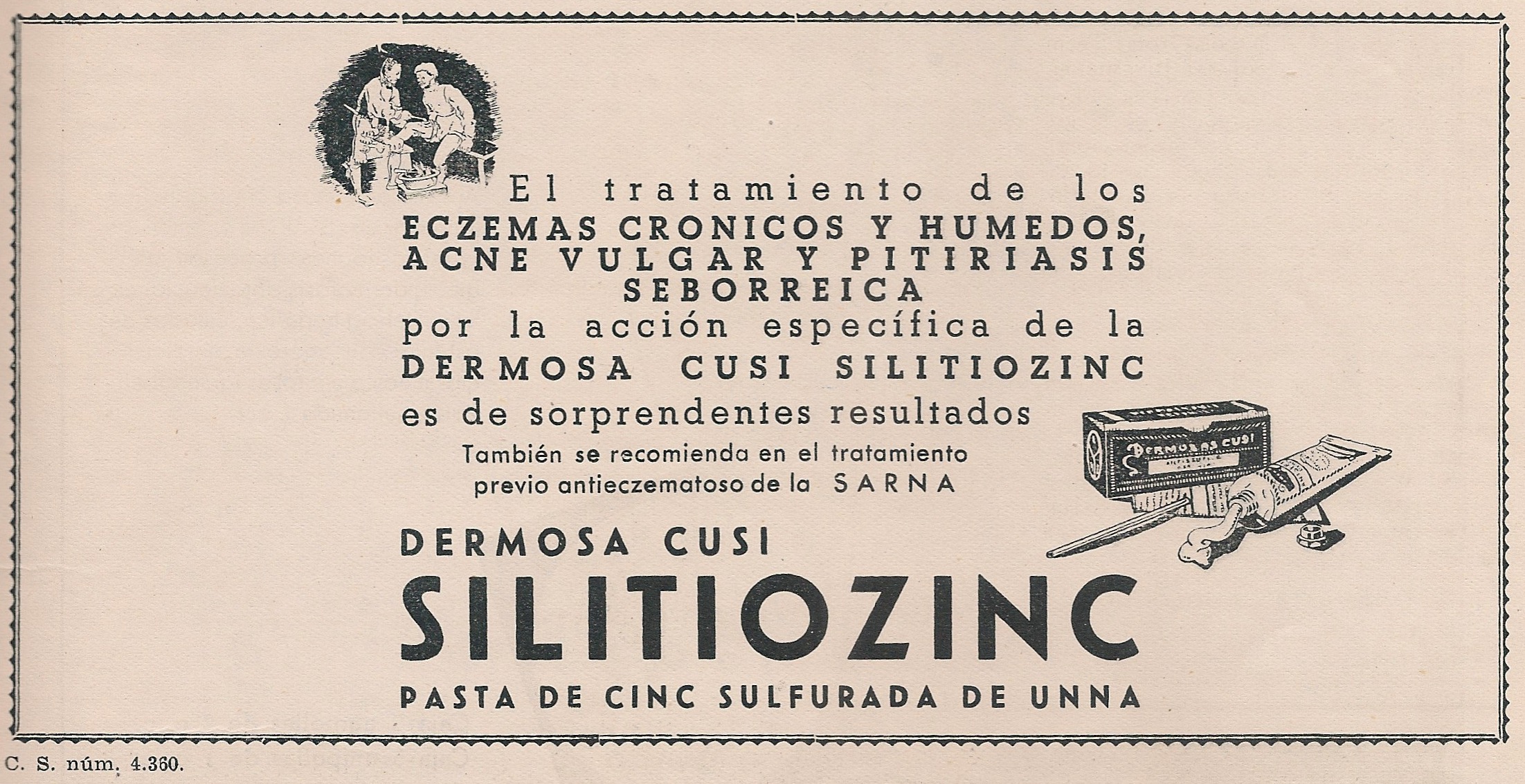 Silitiozinc. Pasta de zinc sulfurada de Unna. Eczemas crónicos y húmedos. Acné, pitiriasis seborreica. Sarna. Hermosa Cusí. Publicidad aparecida en la revista Gaceta Médica Española. Año 18, número 4, 1944.