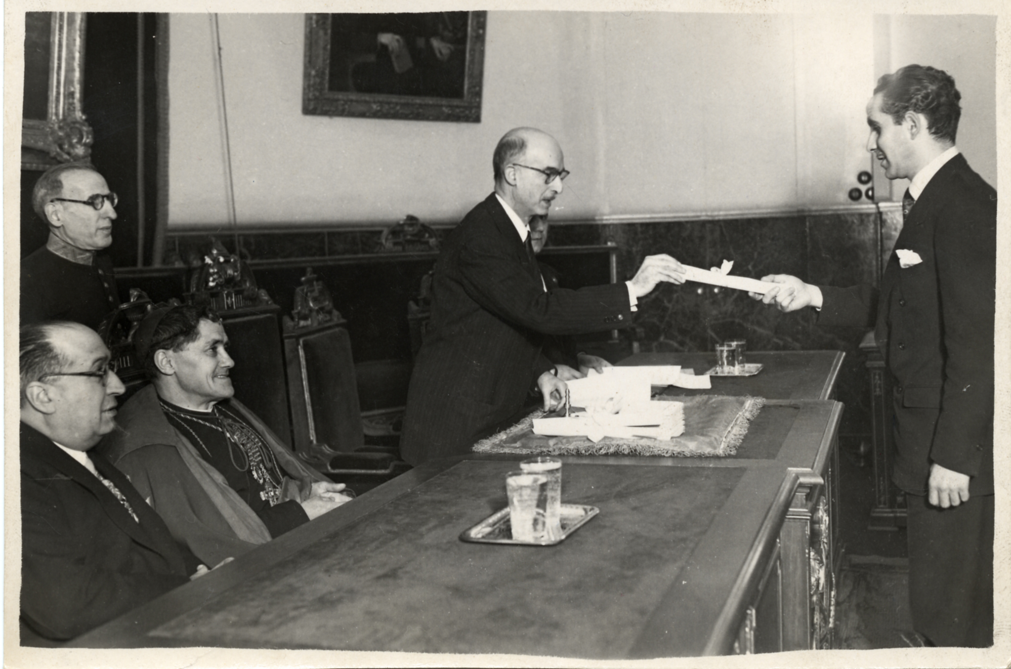 El Presidente de la Real Academia haciendo entrega del diploma correspondiente a uno de los doctores galardonados en el curso 1951-1952