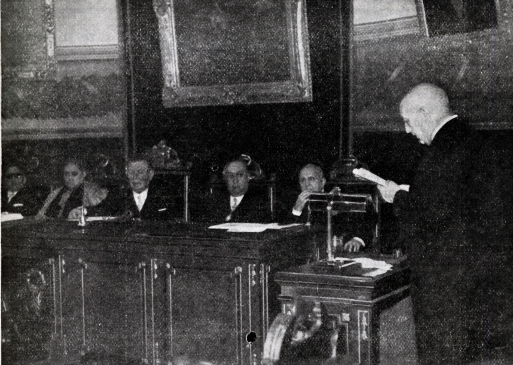 El Prof. Gil y Gil durante la lectura del discurso inaugural de la Solemne Sesión de apertura del curso Académico de 1964 en la Real Academia Nacional de Medicina.En la mesa presidencial: Prof. Palanca (centro), Presidente de la Corporación; a su izquierda, los Dres. Carro (Vicepresidente) y Matilla (Secretario Perpetuo); a su derecha, el Excmo. Arzobispo de Sión, Dr. Luis Alonso Muñoyerro, y el Decano de la Facultad de Medicina de Madrid, Dr. Lorenzo Velázquez.