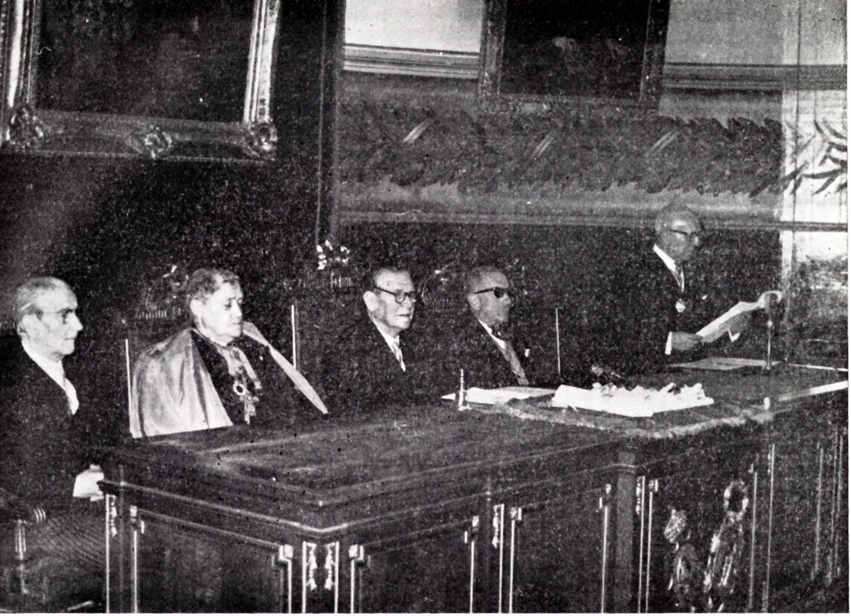 Mesa presidencial de la Solemne Sesión de apertura del curso académico de 1968 en la Real Academia Nacional de Medicina. En el centro, preside el Prof. Palanca; a su derecha, le acompañan el Arzobispo de Sión, Dr. Luis Alonso Muñoyerro, y el Vicepresidente de la Academia, Prof. Bermejillo; a su izquierda, los Dres. Benigno Lorenzo Velázquez, Decano de la Facultad de Medicina de Madrid, y D. Valentín Matilla, Académico Secretario Perpetuo.