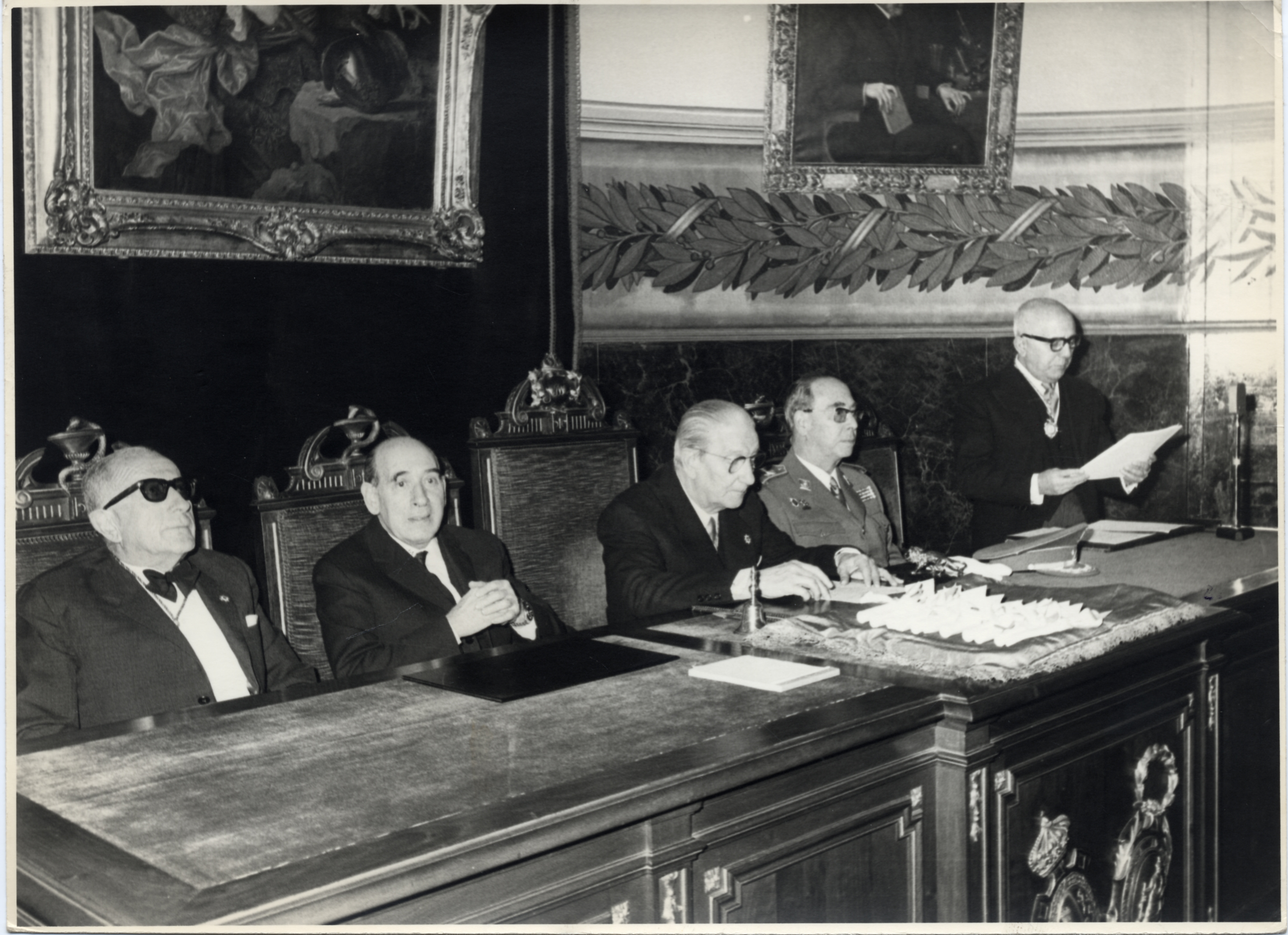 Presidencia de la solemne Sesión de apertura del curso 1971. El Secretario Perpetuo, Prof. Matilla, leyendo la memoria de Secretaría