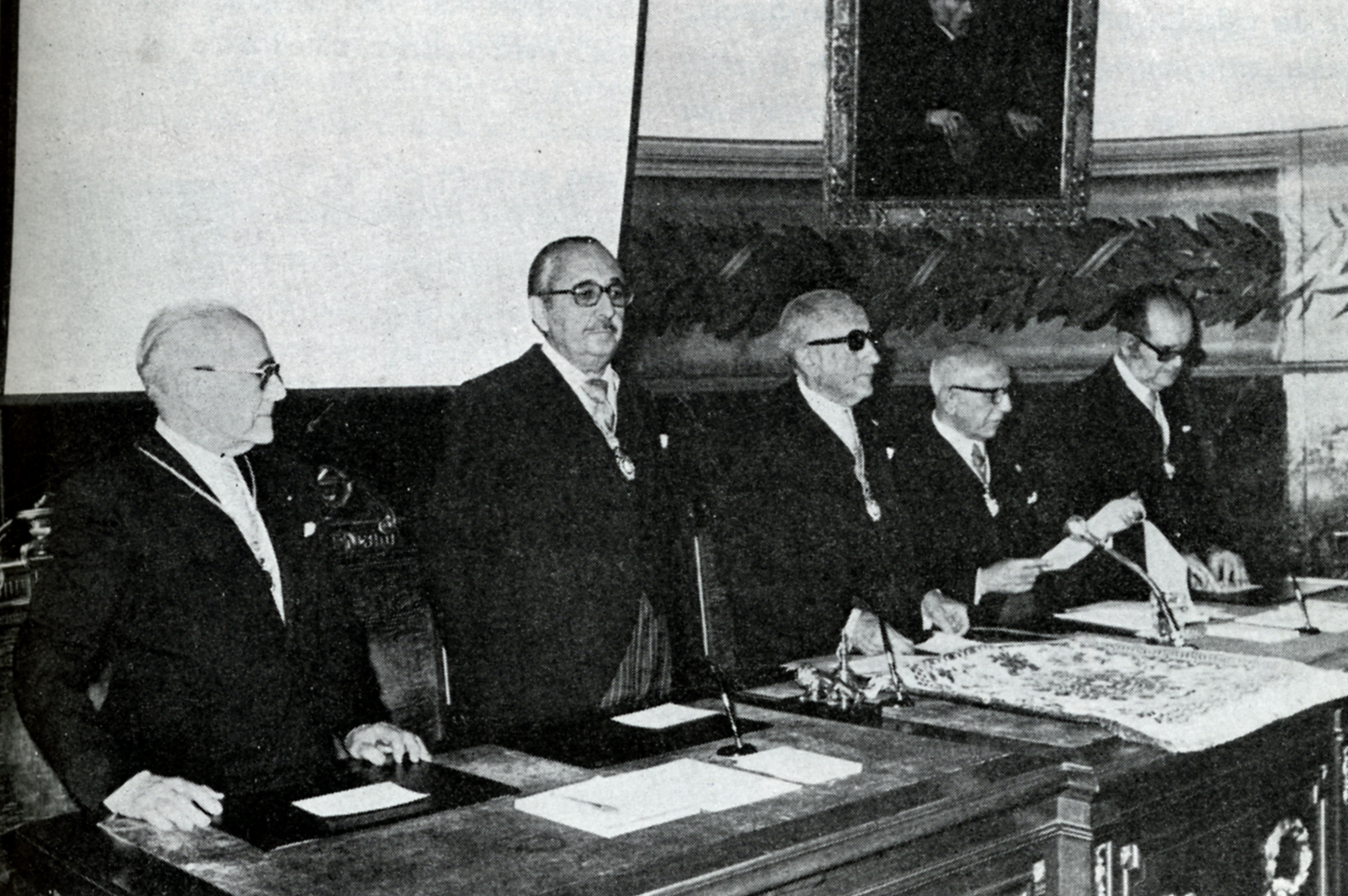 Mesa presidencial de la Solemne sesión de apertura del curso Académico de 1980 en la Real Academia Nacional de Medicina. Preside el Prof. Lorenzo-Velazquez acompañado a su derecha por los Profs. Botella Llusiá y Bosch Marín, y asu izquierda, los Profs. Matilla y Bullón.