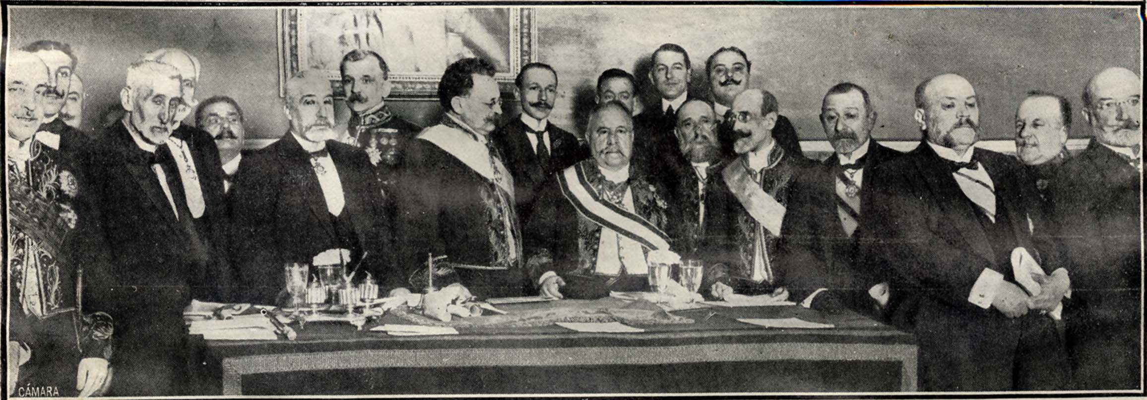 Mesa de la Solemne Sesión inaugural de la Real Academia Nacional de Medicina del curso de 1915. Preside el Excmo. Prof. Carlos María Cortezo junto al Ministro de Instrucción pública, Sr. Collantes.