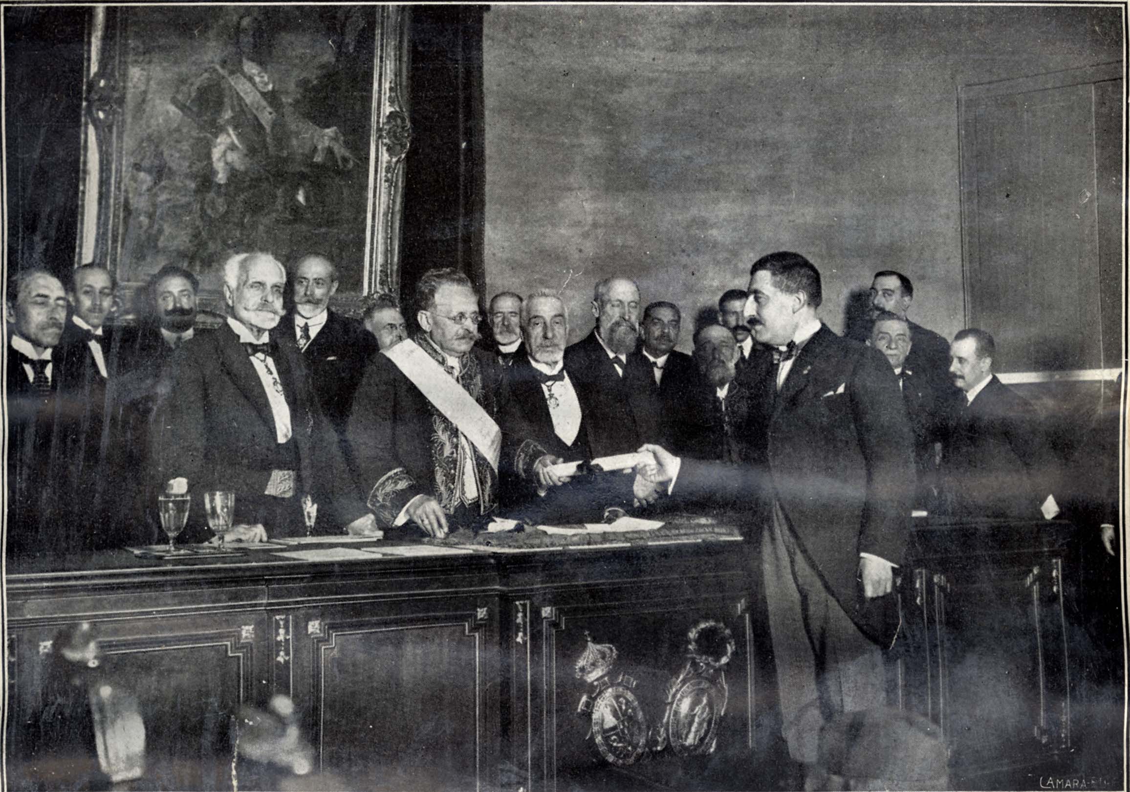 Solemne sesión inaugural de apertura del curso académico de 1920 en la Real Academia Nacional de Medicina. El Dr. Cortezo, Presidente de la Corporación, acompañado por el Dr. Pulido (a su izquierda), Secretario, y del Dr. Fernández-Caro (a su derecha), Vicepresidente, entregando uno de los premios convocados en el curso anterior.
