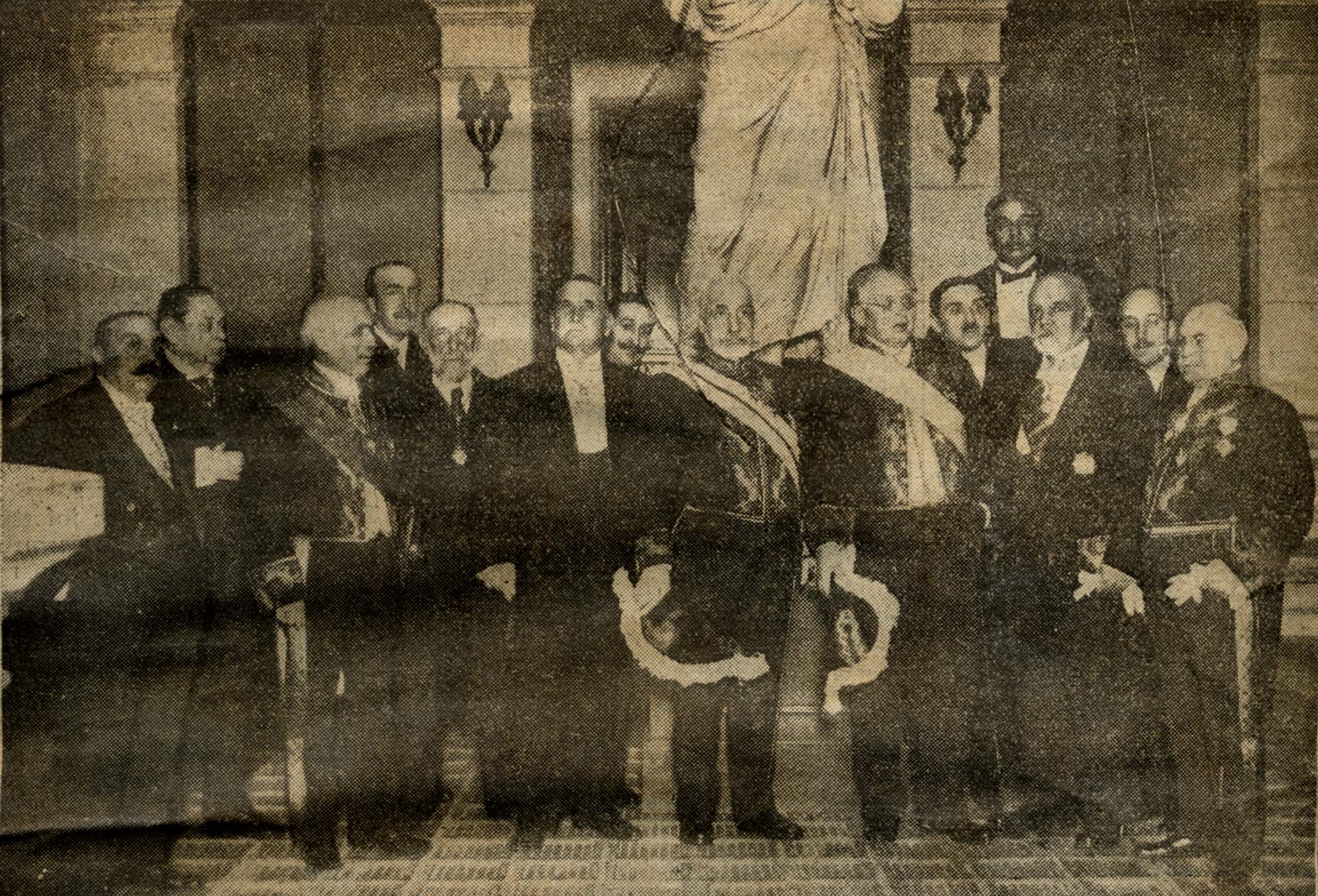 Grupo de académicos posando en el patio de la Real Academia Nacional de Medicina el día de celebración de la Solemne sesión inaugural del curso académico de 1923. En el centro, con banda y sombrero en la mano, los Dres. Pulido (Secretario Perpetuo) y Cortezo (Presidente) de la Corporación.