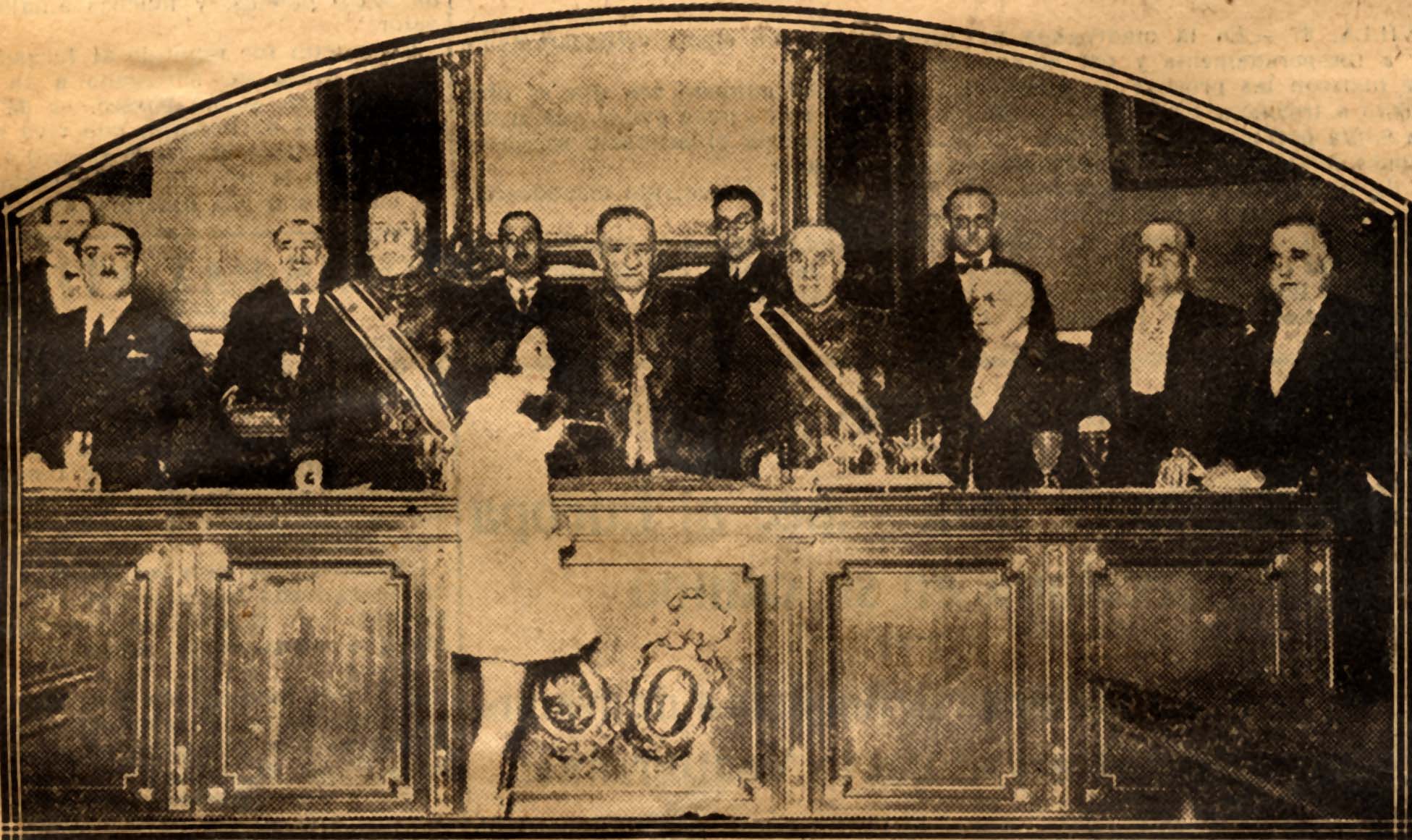El doctor Recaséns, Presidente de la Real Academia Nacional de Medicina, durante el reparto de premios a los niños de las escuelas públicas en el Solemne acto de apertura del curso académico de 1930.
