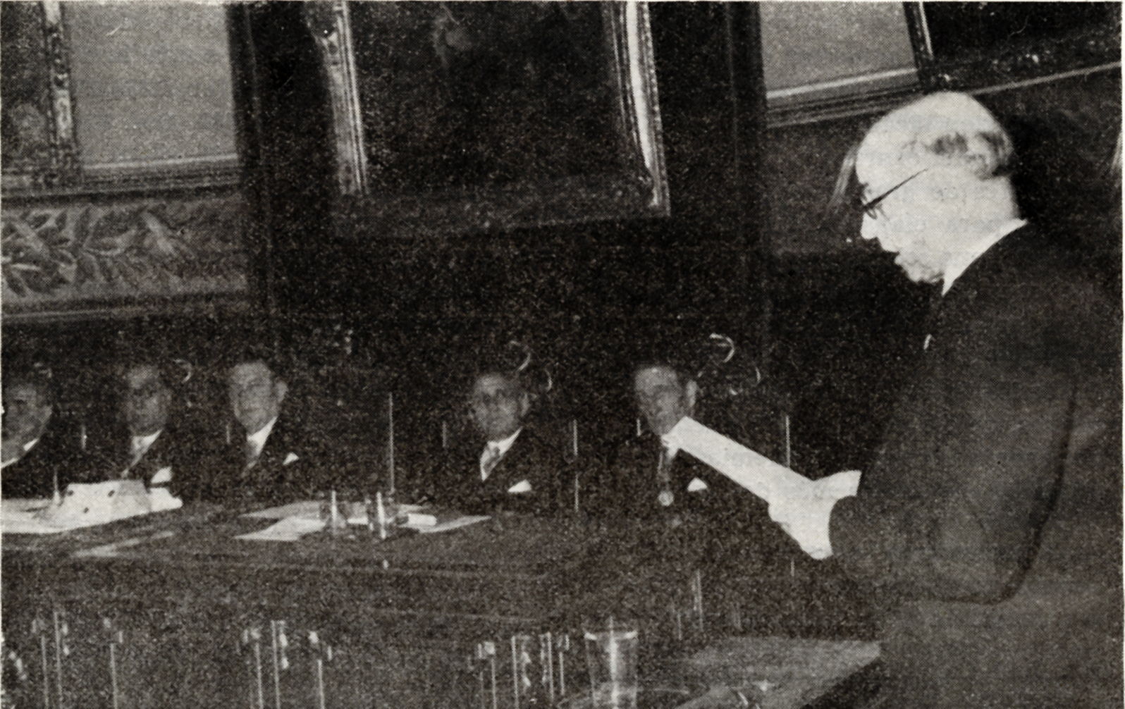 El Prof. Palanca, Presidente de la Real Academia Nacional de Medicina, acompañado en la mesa de los Académicos Dres. Carro, Albasanz (a la izquierda), Matilla y Bermejillo (a la derecha), presidiendo la solemne sesión de apertura del curso académico 1955-1956; en la imagen, el Dr. Carreras da lectura al discurso de precepto.