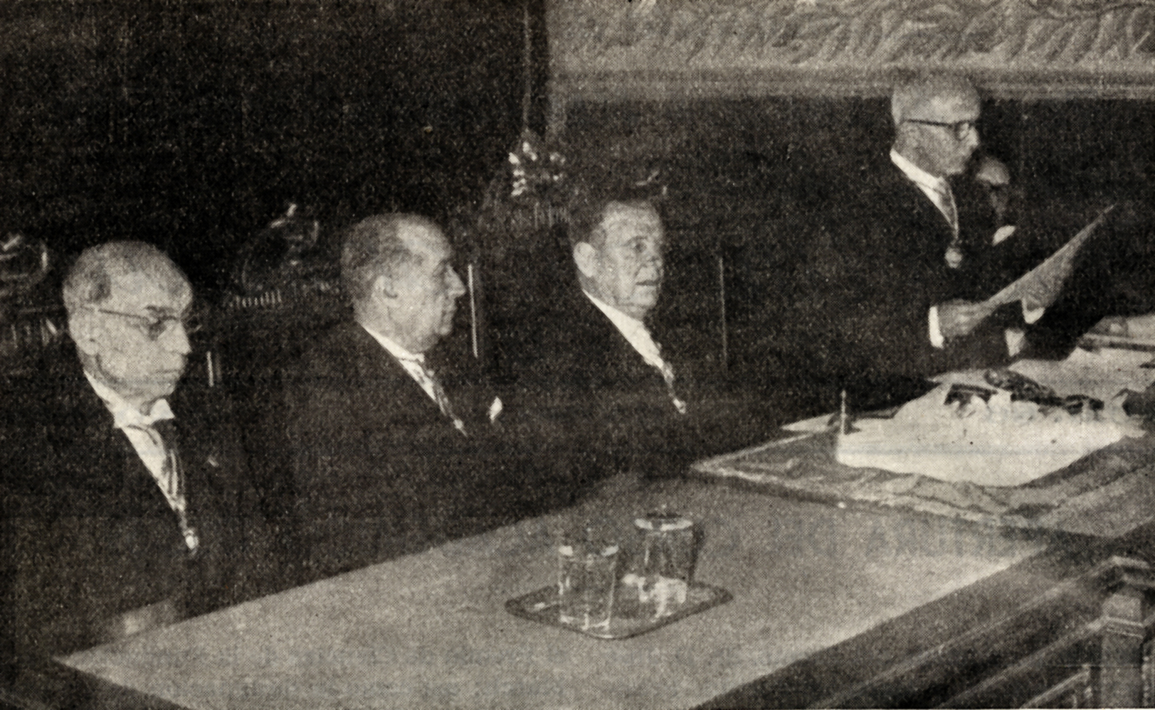 El Dr. Palanca (centro), acompañado de los Dres. Carreras y García Gras (izquierda), Matilla (leyendo la Memoria de Secretaría) y Carro (derecha), presidiendo el acto de apertura del curso en la Real Academia Nacional de Medicina.