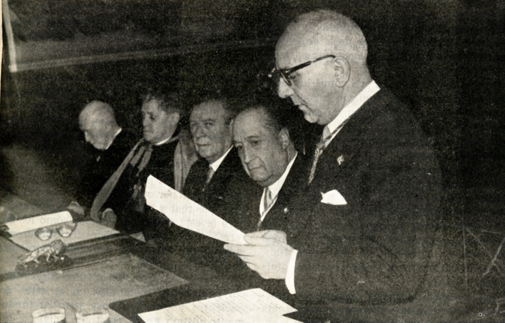 Mesa presidencial del acto de Apertura de Curso Académico 1962-1963 en la Real Academia Nacional de Medicina. De derecha a izquierda, el Secretario Perpetuo, Prof. Matilla, leyendo la Memoria de Secretaría, el Vicepresidente, Prof. Carro, el Presidente, Prof. Palanca, el Arzobispo de Sió, Dr. Muñoyerro, y el Prof. Obdulio Fernández.