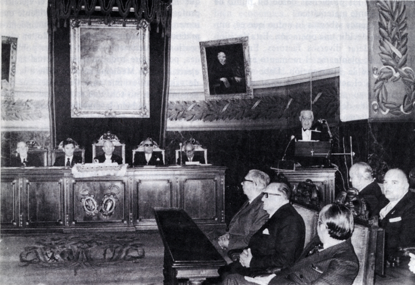 El Presidente de la Real Academia Nacional de Medicina, Prof. Bermejillo, presidiendo el acto de Inauguración del curso académico de 1977. Le acompañan, a su derecha, el Director General de Sanidad, D. Vicente Arroyo Arroyo, y el Prof. Obdulio Fernández; a su izquierda, los Dres. Lorenzo-Velázquez, Vicepresidente de la Corporación, y Valentín Matilla, Secretario Perpetuo de la misma. A la derecha de la imagen, el Prof. Vara López dando lectura al discurso inaugural de precepto.