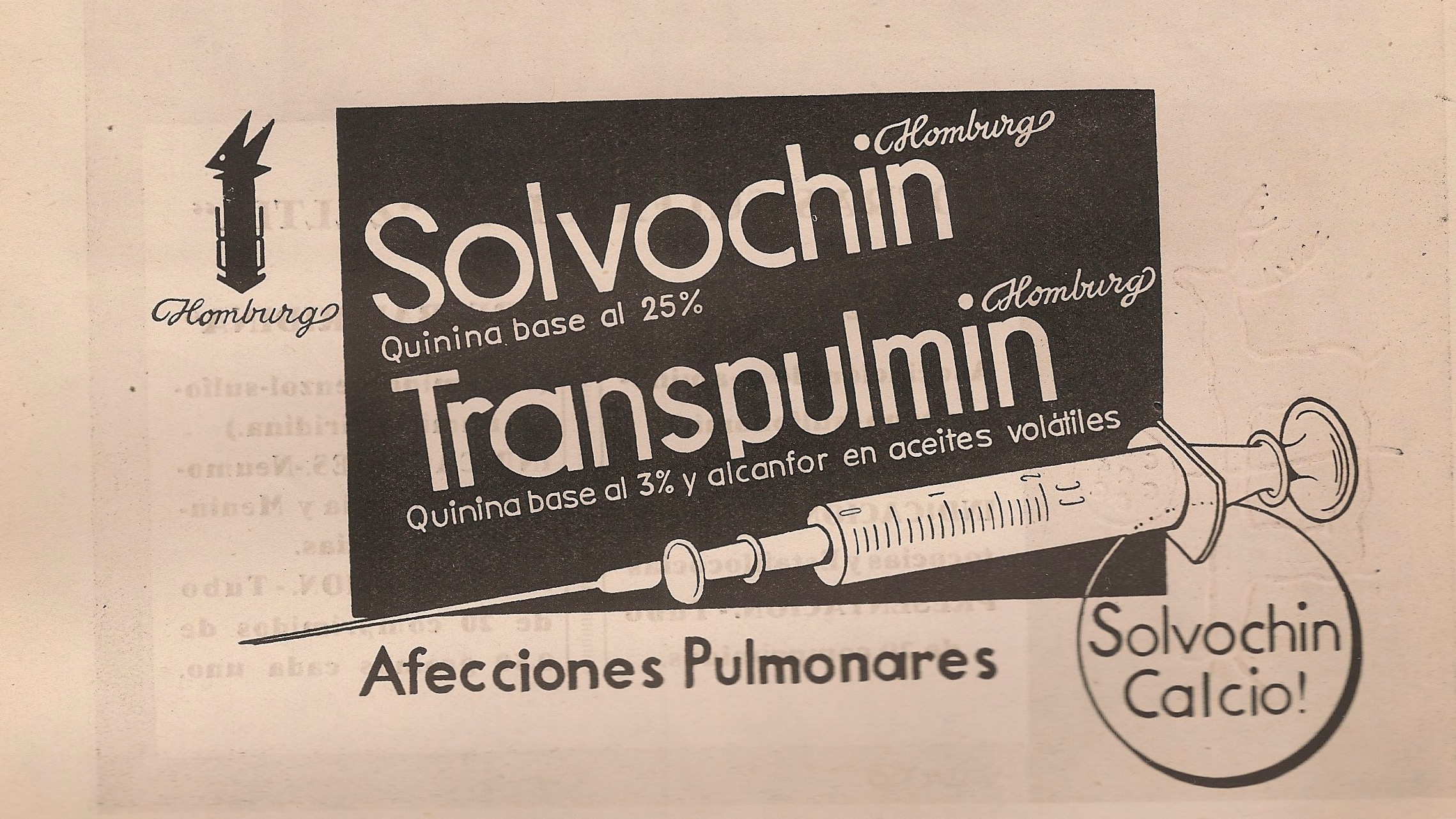 Solvochín: quinina. Transpulmín: quinina y alcanfor en aceite volátiles. Afecciones pulmonares. Publicidad aparecida en la revista Gaceta Médica Española. Año 18, número 2, 1944.