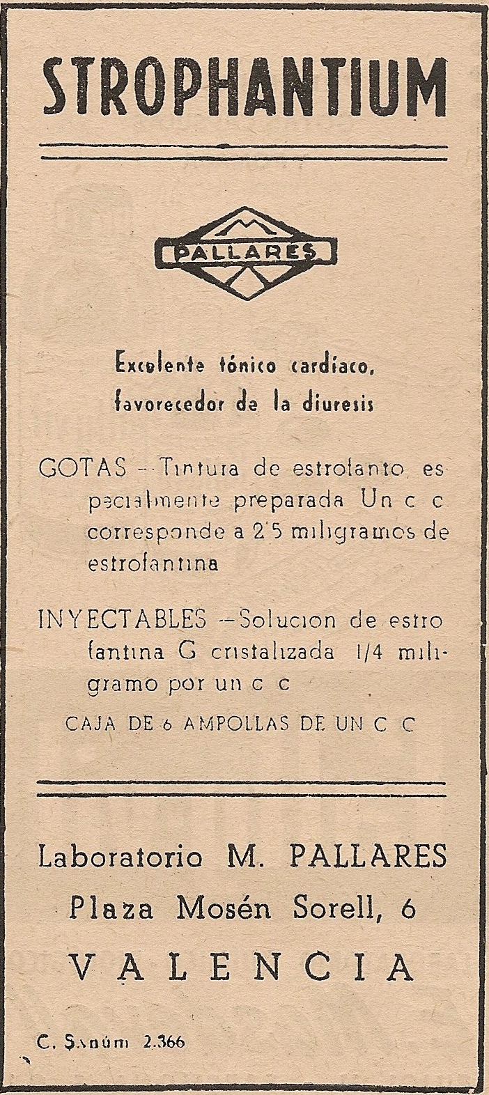 Strophantium. Tonico cardiaco. Favorecedor de la diuresis. Laboratorio M. Pallarés. Valencia. Publicidad aparecida en Gaceta Médica Española. Noviembre 1953, año XXVII, número 11.