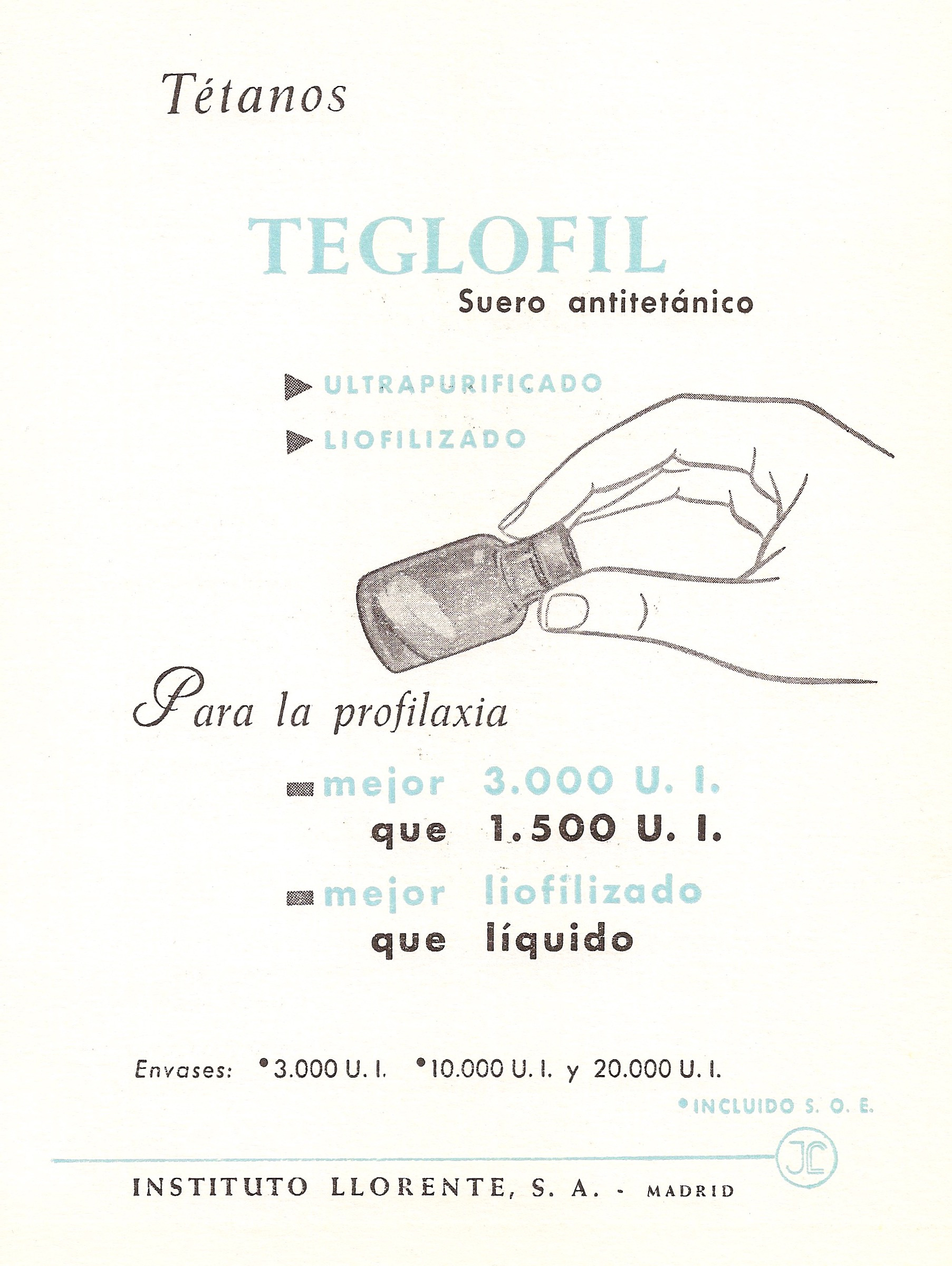 Suero antitetánico ultrapurificado y liofilizado. Instituto Llorente S.A., Madrid. Archivos de la Facultad de Medicina de Madrid, 1965.