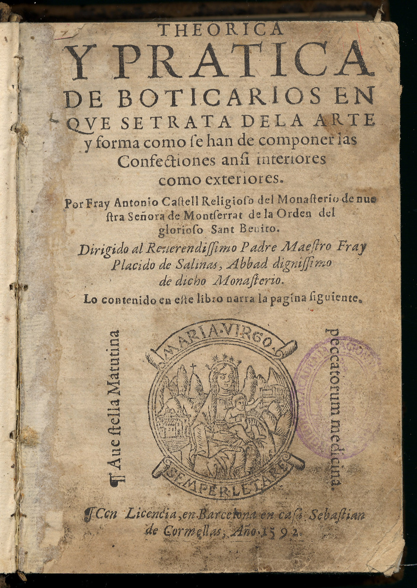 CASTELL, Antonio (S. B.) (1572-1640). — Theórica y prática de boticarios. — En Barcelona : Sebastián de Cormellas, 1592. — pág. var. ; 4º (14 cm) — Pasta.