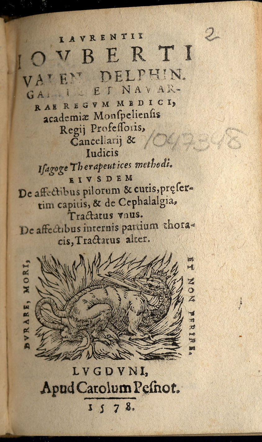 JOUBERT, Laurent (1529-1583). — Therapeutices methodi… — Lugduni : apud Carolum Pesnot, 1578. — [24] 232 p. ; 12º (12 cm). – Perg.