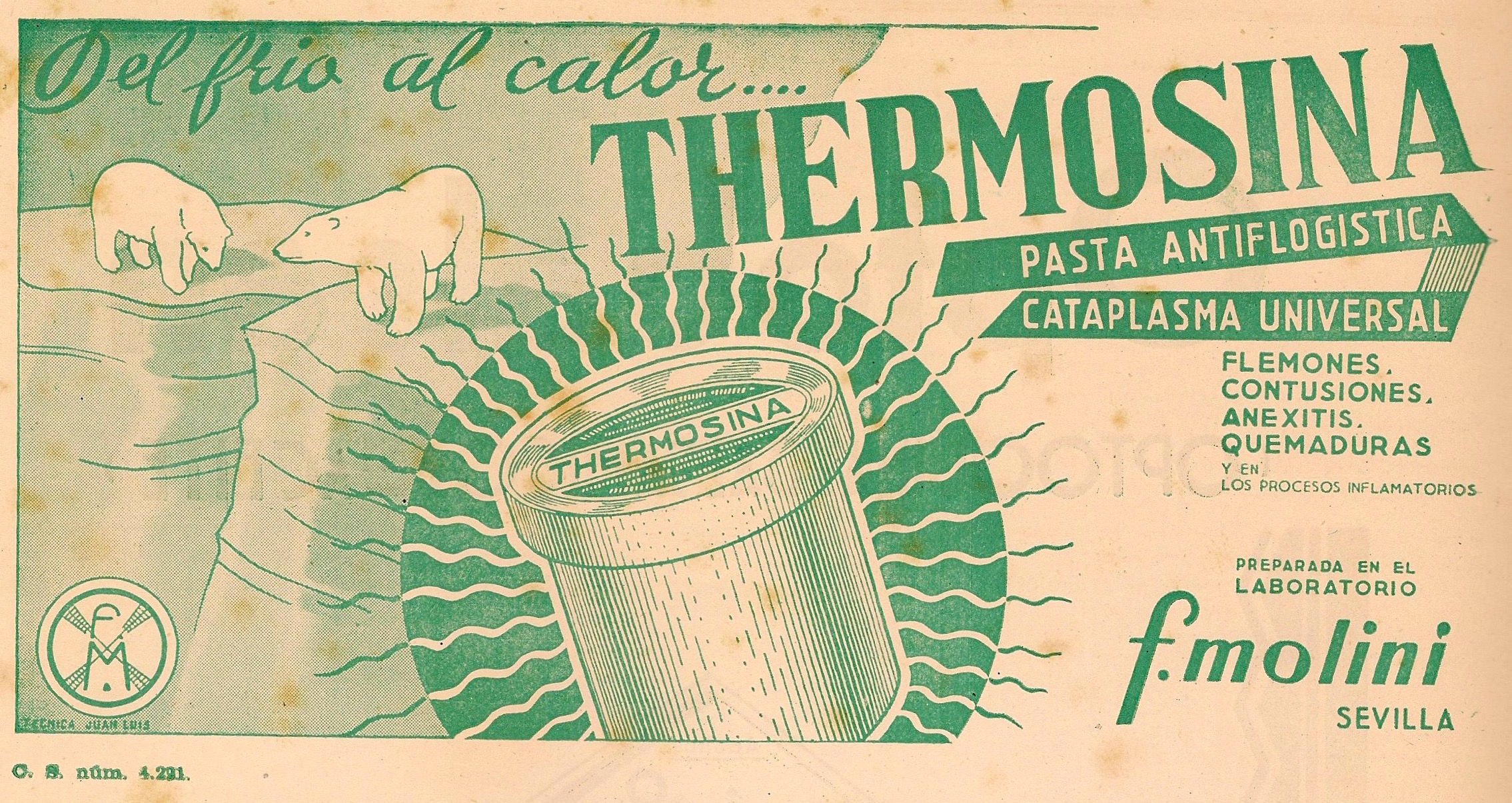 Thermosina. Pasta, cataplasma. Flemones, contusiones, anexitis, quemaduras. F. Moliní. Sevilla. Publicidad aparecida en la revista Gaceta Médica Española. Año 18, número 1, 1944.