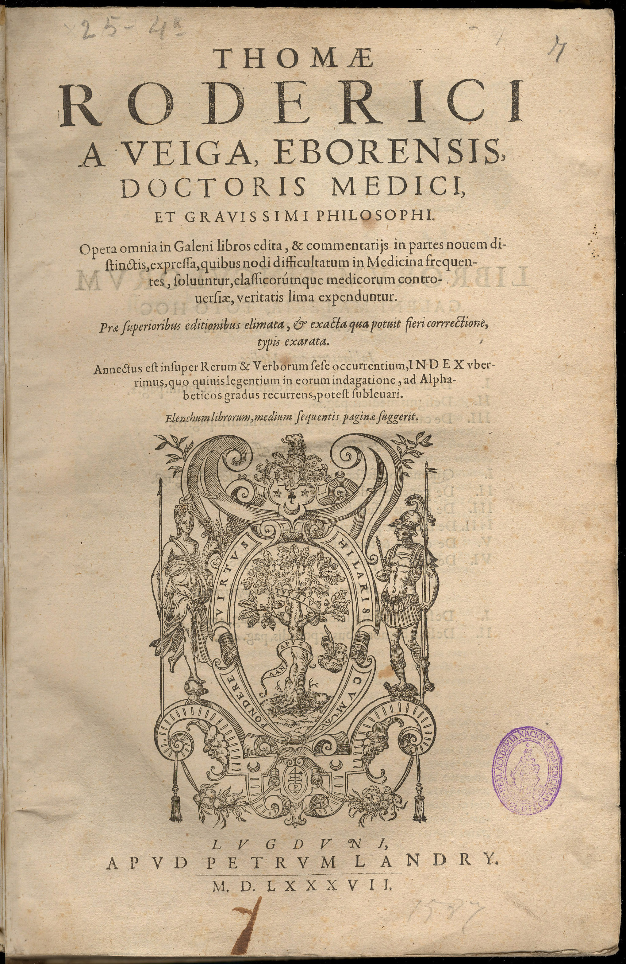 RODRIGUES DA VEIGA, Tomás. – Thomae Roderici a Veiga (…) Opera Omnia in Galeni libros edita (…). – Lvgdvni : apvd Petrvm Landry, 1587. – [6], 500, [20] p. ; fol. (34 cm). – Perg.