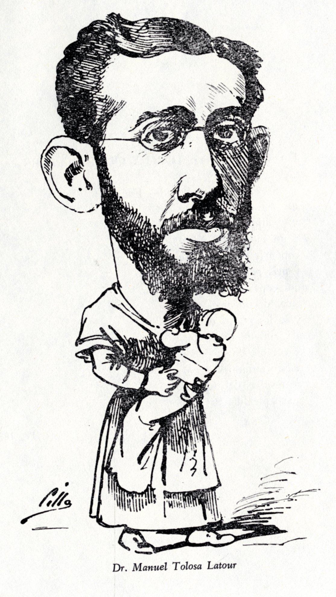 Caricatura del Dr. D. Manuel Tolosa Latour (1857 – 1919) , por Cilla, sacada del libro del Prof. D. Luís Sánchez Granjel, ‘Biografía de “El Dr. Sangredo” (1883-1884)’, que fue una revista médica del siglo XIX que se subtitulaba “Revista satírica quincenal. Dedicada a los hijos de Esculapio”. Pag. 139.