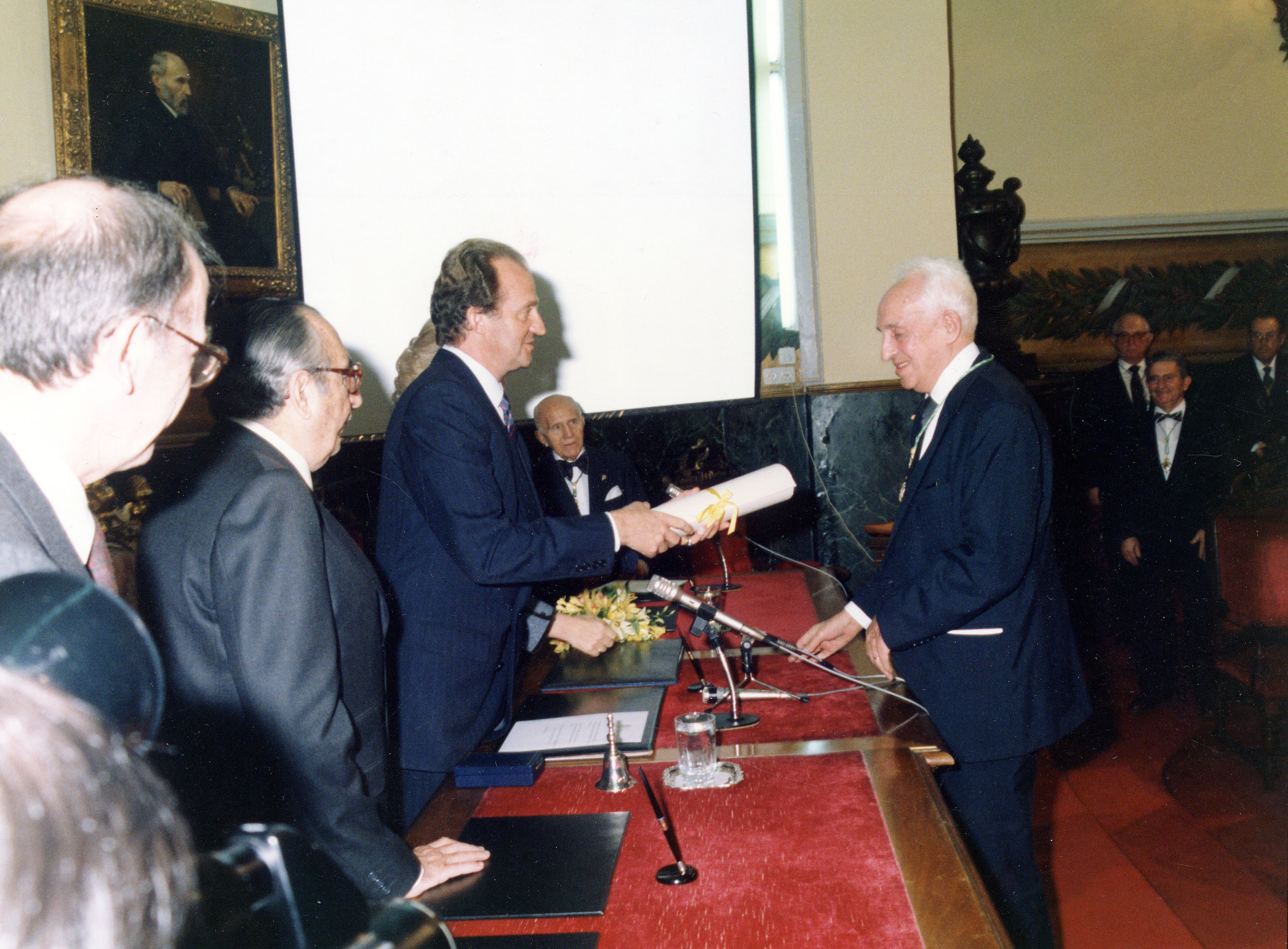 Su Majestad el Rey D. Juan Carlos I, haciendo entrega del título de Académico de Honor de la Real Academia Nacional de Medicina al Prof. Severo Ochoa Carrillo de Albornoz el 3 de Febrero de 1987.