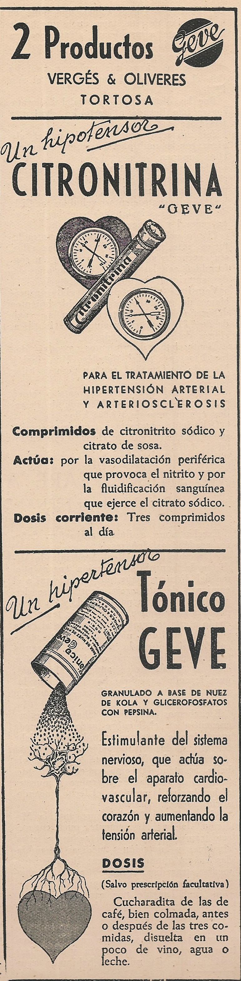 Tónico Gevé. Un hipertensor. Estimulante del sistema nervioso. Vergés & Oliveres. Tortas. Geve. Publicidad aparecida en la revista Gaceta Médica Española, año XIX, número 5. 1945.
