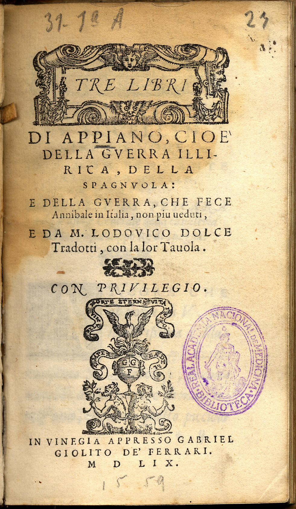 APIANO. – Tre libri di Appiano : cio é della guerra illirica, della spagnuola e della guerra chi fece Annibale in Italia, non piu veduti. – Vinegia : Appresso Gabriel Giolito de Ferrari, 1559. – [24], 229 p. ; 12º [15 cm.]. – Perg.