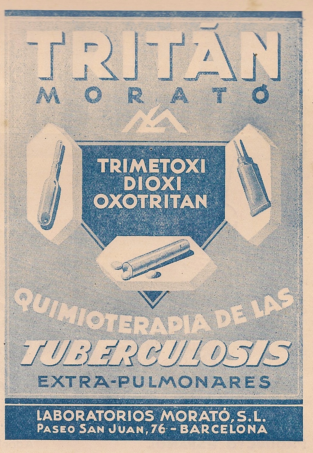 Tritan. Trimetoxi dioxi oxotrital. Tratamiento de la tuberculosis extra pulmonares. Laboratorios Morató SL. Barcelona. Publicidad aparecida en la revista Gaceta Médica Española. Año 18, número 1, 1944.