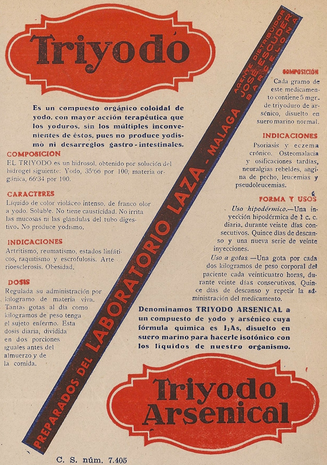 Triyodo. Triyodo Arsenical. Yodo. Artritismo, reumatismo, estados linfático, raquitismo, escrofulosis, arterioesclerosis, obesidad. Laboratorios LAZA. Málaga. Publicidad aparecida en la contraportada de la revista Gaceta Médica Española, año XIX, número 5. 1945.