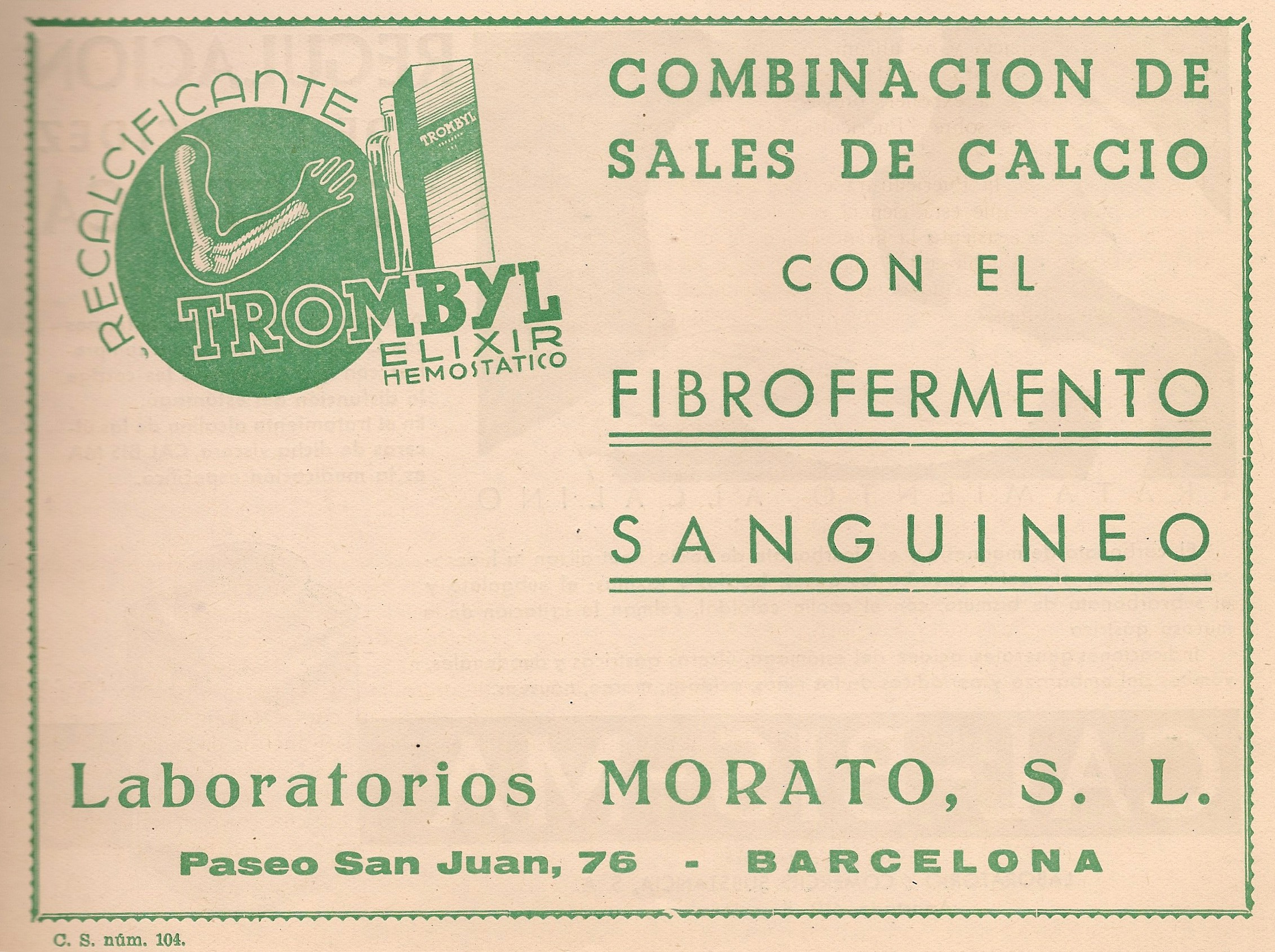 Trombyl. Hemostático. Elixir. Sales de calcio. Laboratorio Maroto S.L. Barcelona. Publicidad aparecida en la revista Gaceta Médica Española. Año 18, número 2, 1944.