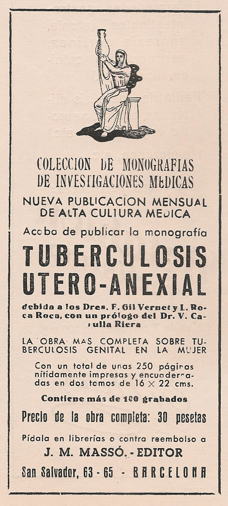 Tuberculosis Utero-genital. Libro sobre la tuberculosis genital de la mujer por los Dres. F. Gil Vernet y L. Roca Roca. J.M. Massó. Editor. Barcelona. Publicidad aparecida en la revista Gaceta médica Española. Año 18, número 6, 1944.