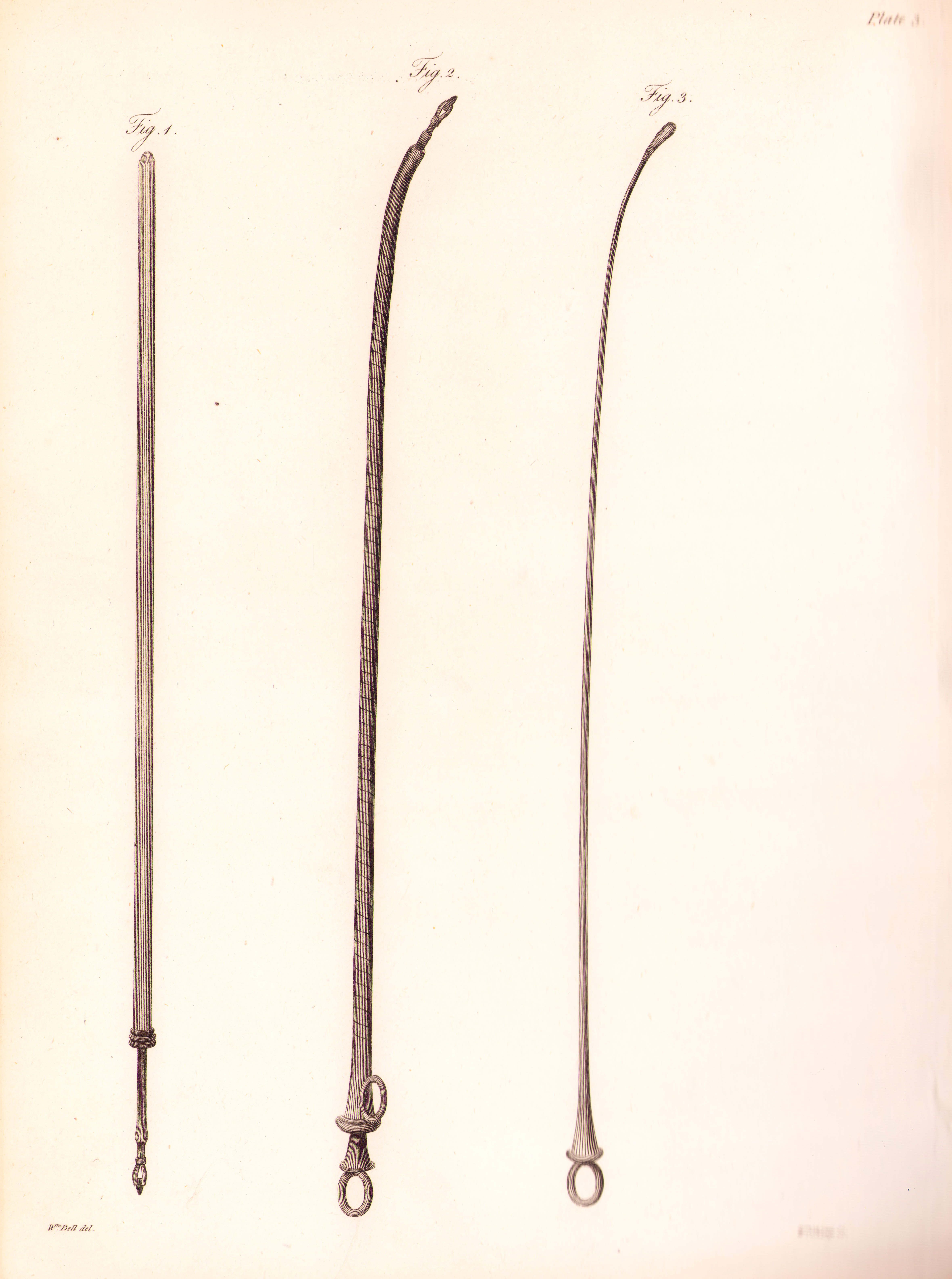 Fig II. Fig III. A flexible canula for applying the caustic to strictures in the bend of the urethra. The wire with the small port-crayon is push.ed out beyond it’s end.