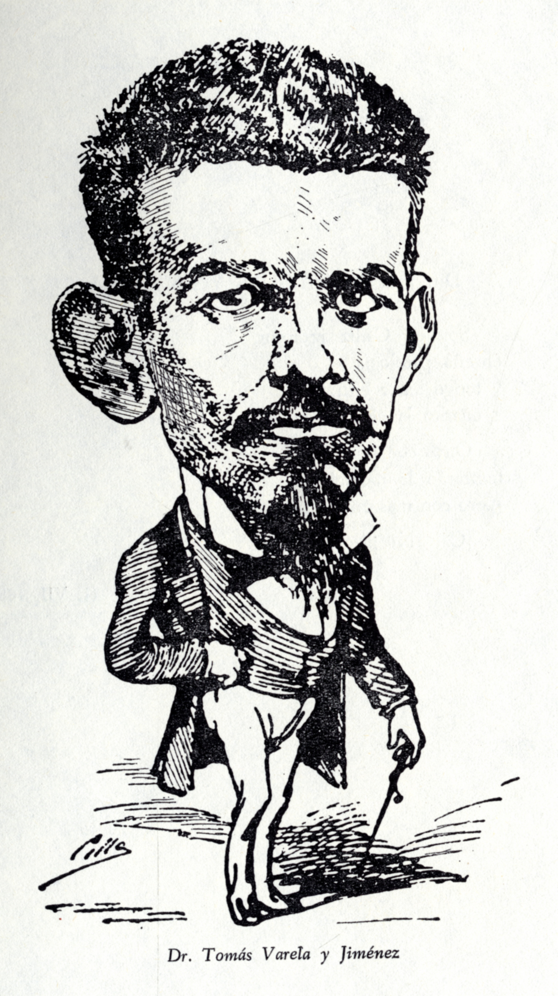Caricatura del Dr. D. Tomás Varela Jiménez , por Cilla, sacada del libro del Prof. D. Luís Sánchez Granjel, ‘Biografía de “El Dr. Sangredo” (1883-1884)’, que fue una revista médica del siglo XIX que se subtitulaba “Revista satírica quincenal. Dedicada a los hijos de Esculapio”. Pag. 147.