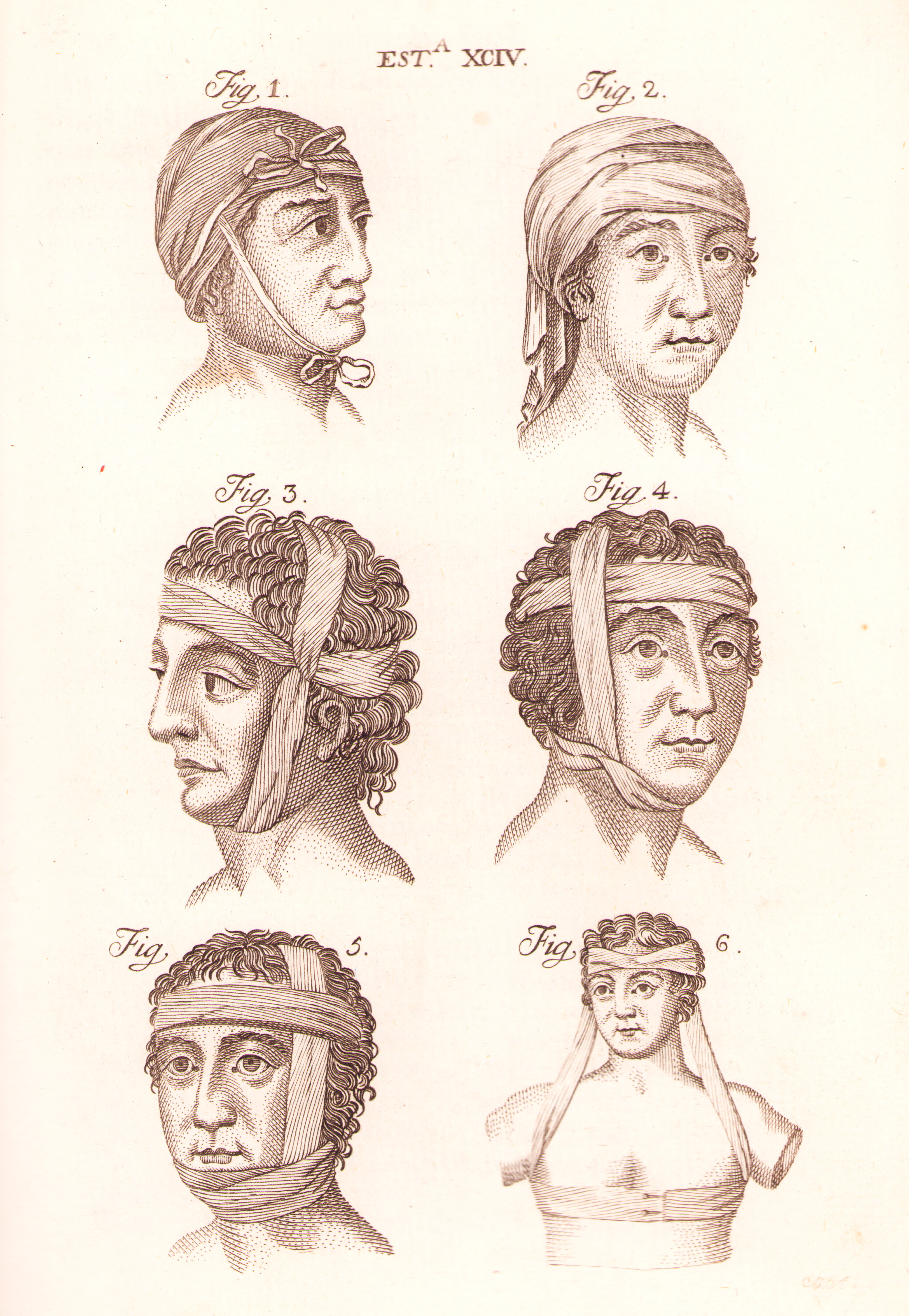 Lámina 94: Diversos vendajes para la cabeza.
