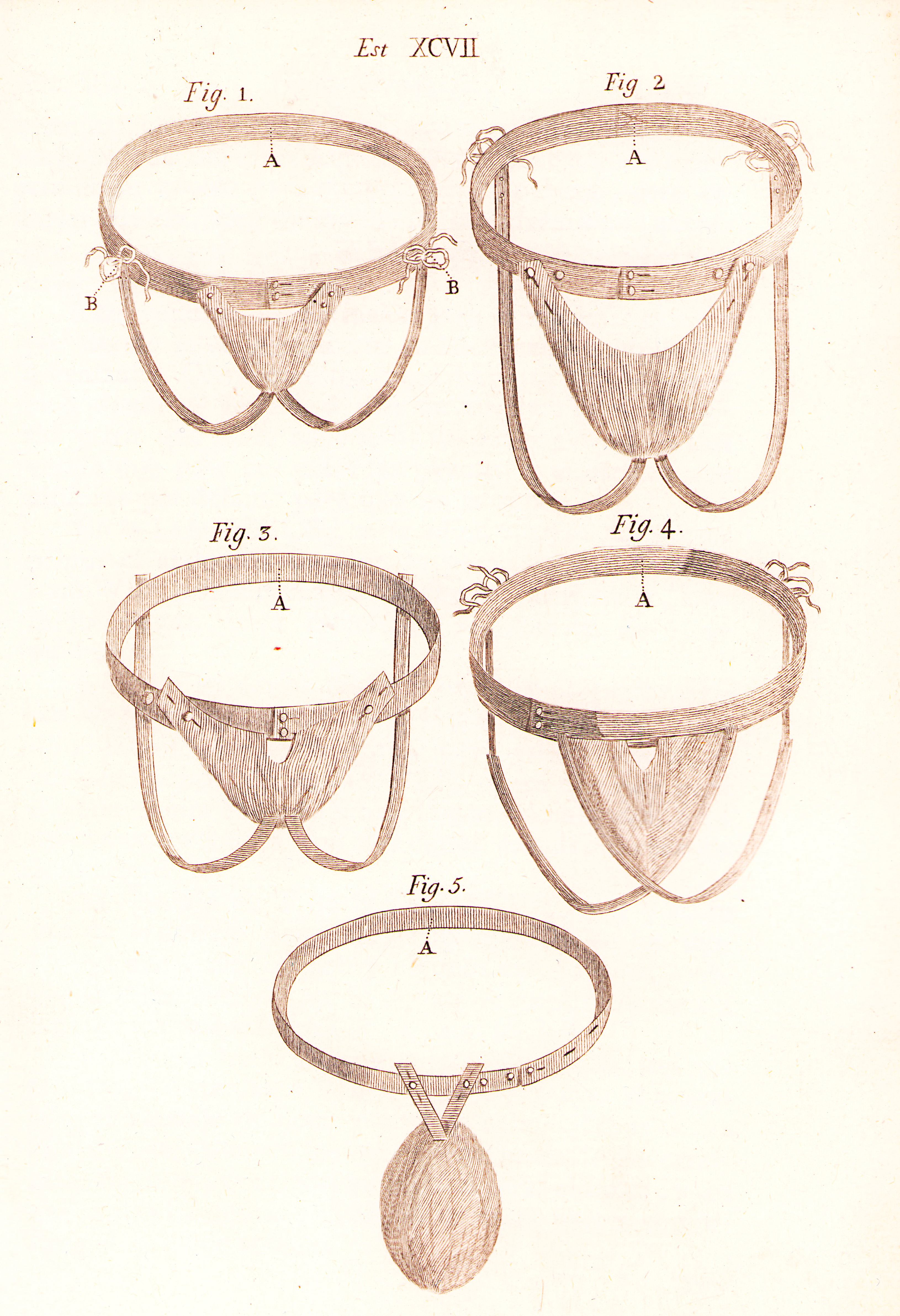 Lámina 97:Diferentes suspensorios o bragueros del escroto.