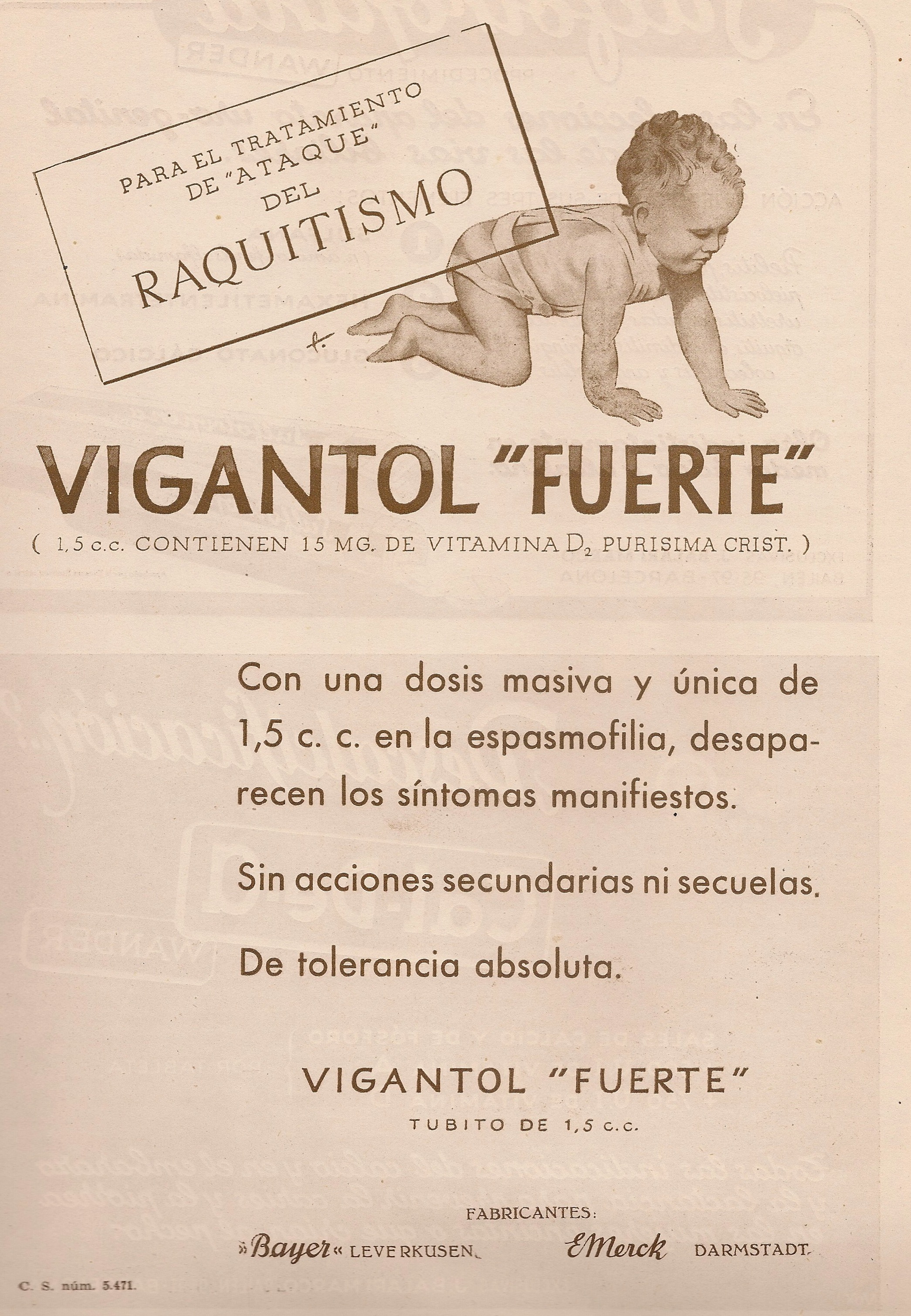 Vigantol fuerte. Vitamina D. Dosis única. Raquitismo, espasmofília. Bayer. Merck. Publicidad aparecida en la revista Gaceta médica Española. Año 18, número 5, 1944.