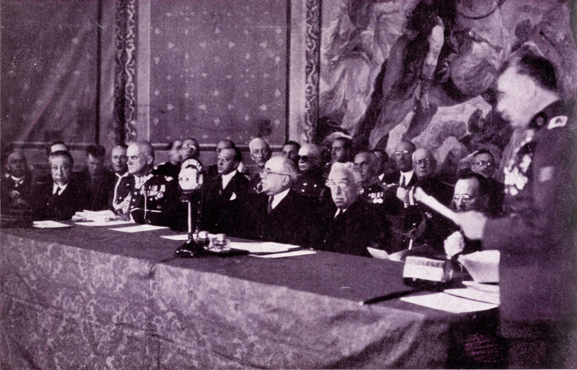 Mesa presidencial en la sesión de apertura del VII Congreso Internacional de Medicina y Farmacia Militares (Madrid, 1933). Asistieron S. E. el presidente de la República y los sres. Ministros de la Guerra y Marina. Gaceta Médica Española, 82, Jul. 1933