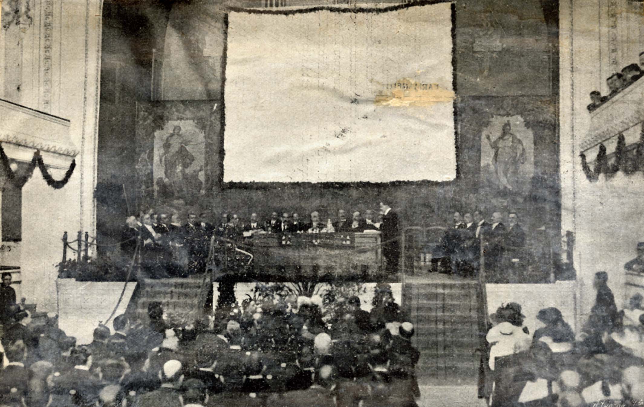 Aspecto del Salón de la Filarmónica de Bilbao donde se celebró en Septiembre de 1916 el VIII Congreso dental. En el centro de la mesa presidencial, el Dr. Pulido, presidiendo el acto de apertura como representante de Su Majestad el Rey y del Gobierno.
