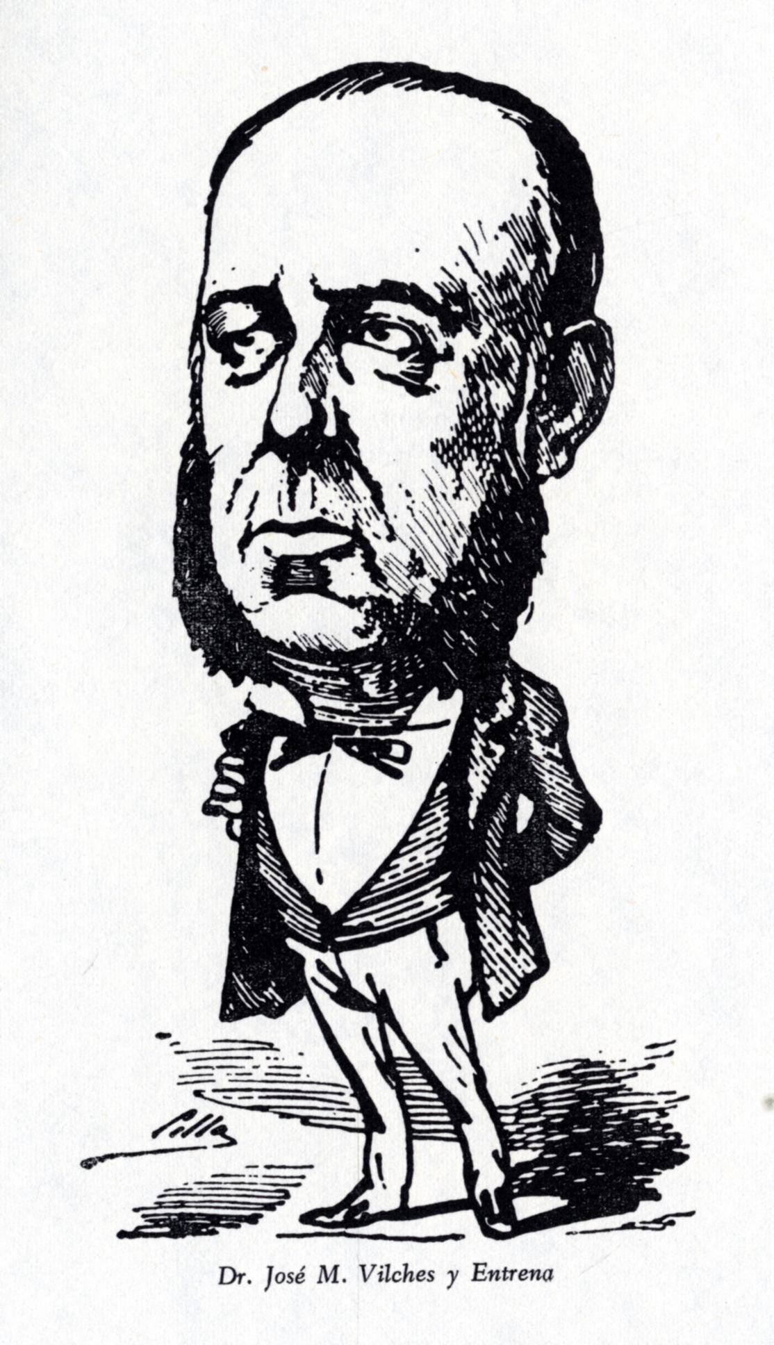 Caricatura del Dr. D. José María Vilches Entrena (? – 1897) , por Cilla, sacada del libro del Prof. D. Luís Sánchez Granjel, ‘Biografía de “El Dr. Sangredo” (1883-1884)’, que fue una revista médica del siglo XIX que se subtitulaba “Revista satírica quincenal. Dedicada a los hijos de Esculapio”. Pag. 149.