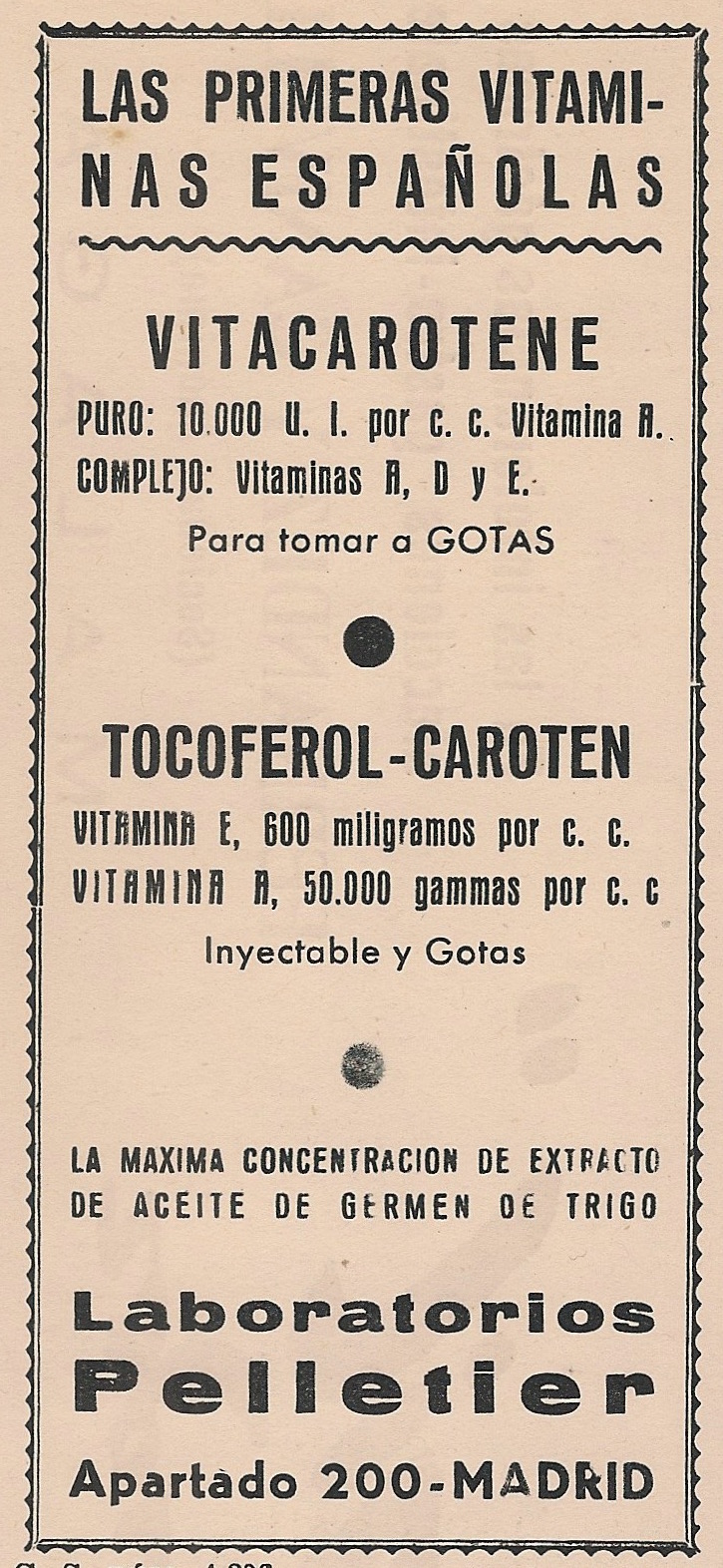 Vitacaroten: vitamina A, vitamina D, vitamina E. Tocoferol-Caroten. Laboratorios Pelletier. Madrid. Anuncio aparecido en la portada de la revista Gaceta Médica Española. Año 18, número 2, 1944