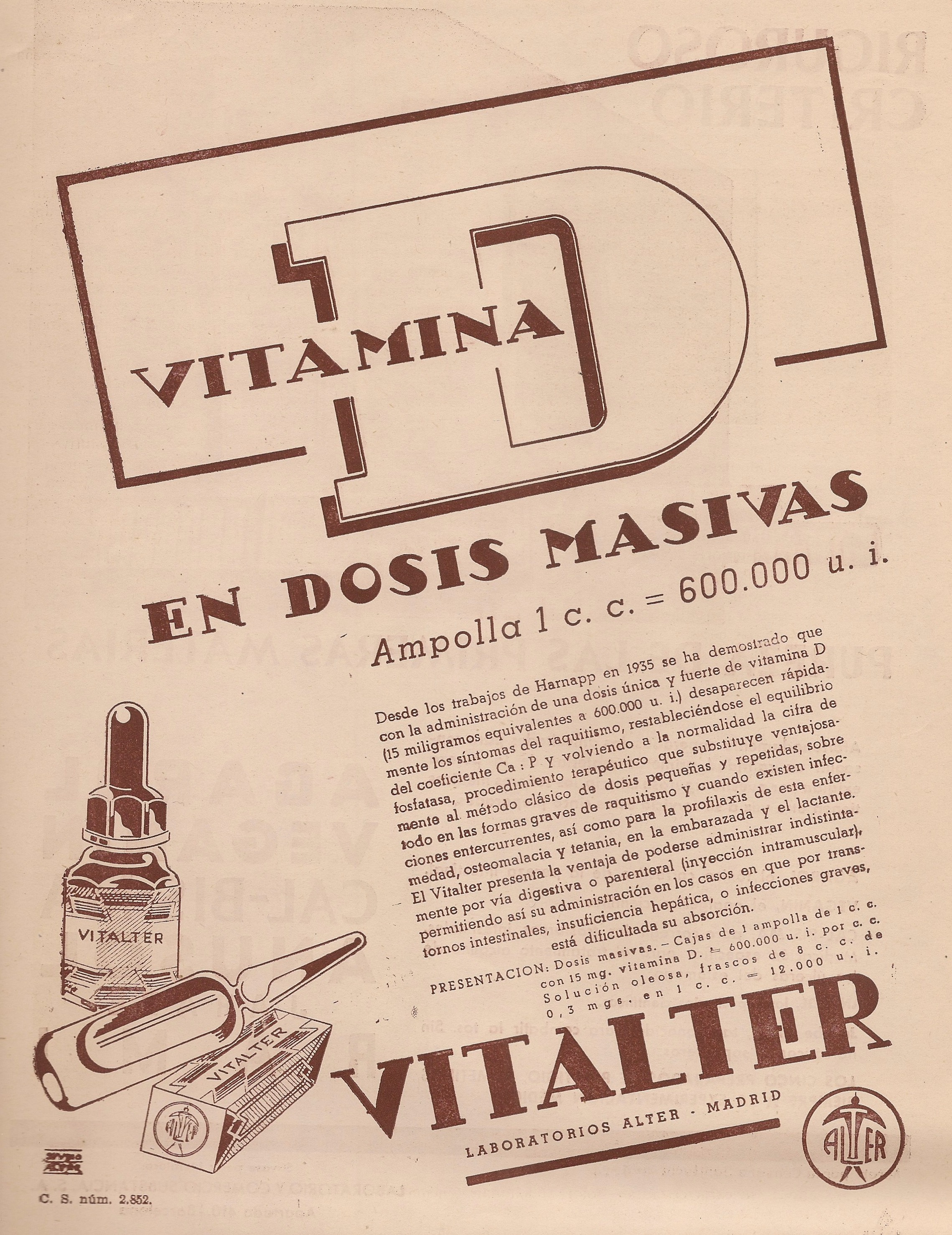 Vitalter. Vitamina D. Ampollas. Laboratorios Alter. Madrid. Publicidad aparecida en la revista Gaceta Médica Española. Año 18, número 2, 1944.