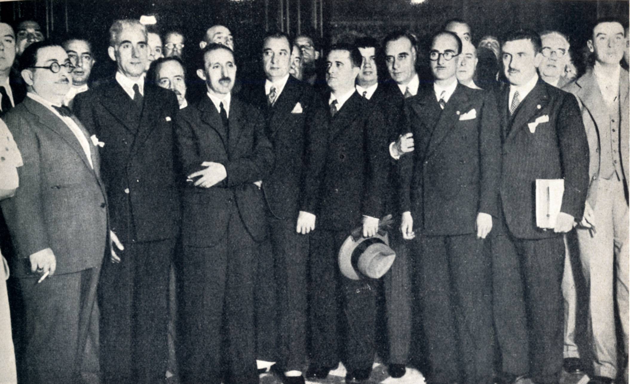 X Asamblea de Colegios Médicos de España. Sesión Inaugural. El Subsecretario de Sanidad, doctor Pérez Mateos, con las autoridades donostiarras y los Presidentes de los Colegios despues de inaugurar la X Asamblea de Colegios Médicos y la II de la Previsión Médica. Gaceta Médica Española, 97, Oct. 1934