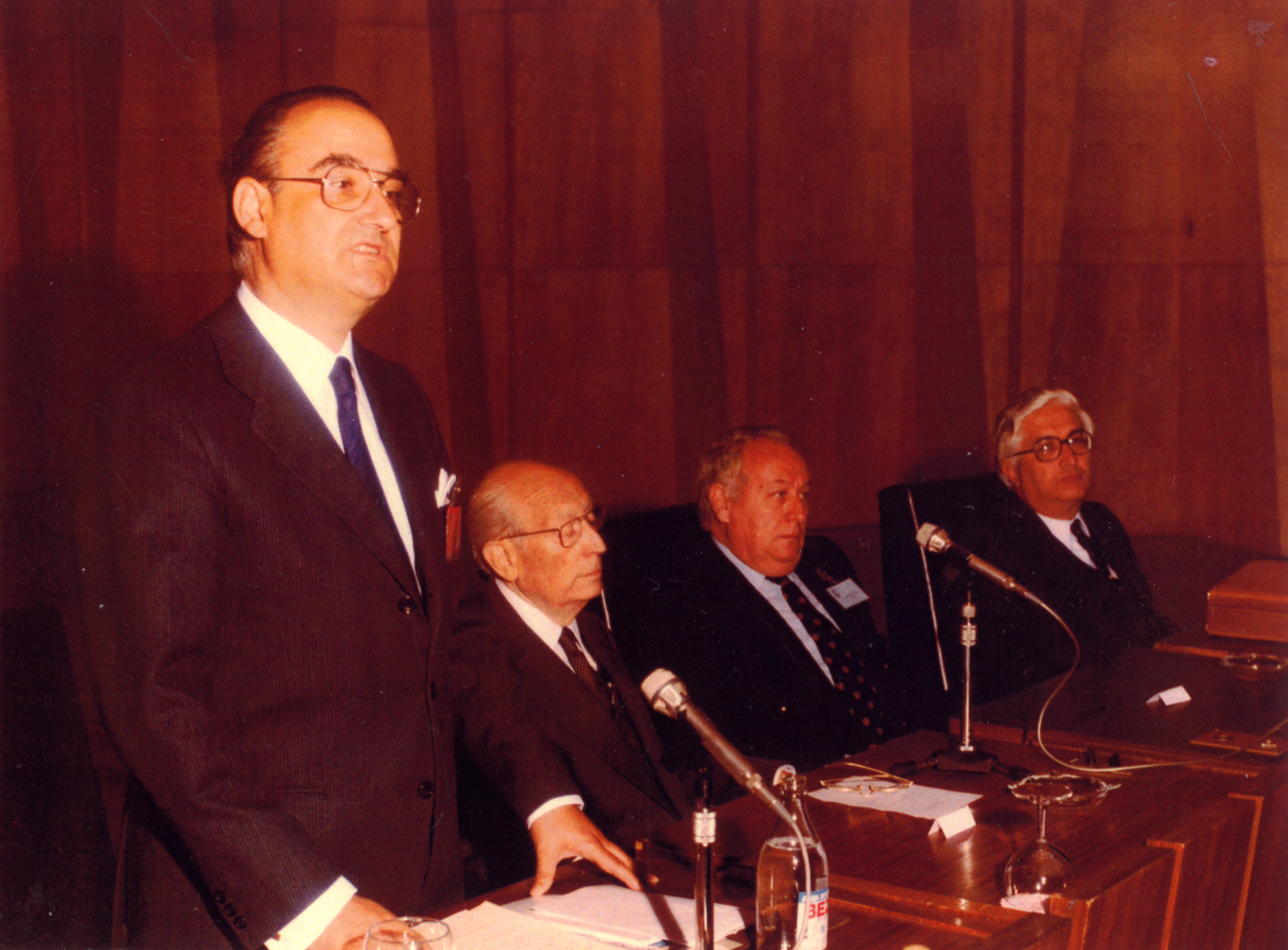 XVI Congreso Nacional de Pediatría, Madrid, 1985. De izquierda a derecha : Dres. Enrique Casado de Frías (Catedrático de Pediatría y Presidente del Congreso), E. Tierno Galván (Alcalde de Madrid), J. Colomer (Catedrático de Pediatría, Valencia), y Vicente Moya (Decano de Medicina, Universidad Complutense de Madrid).