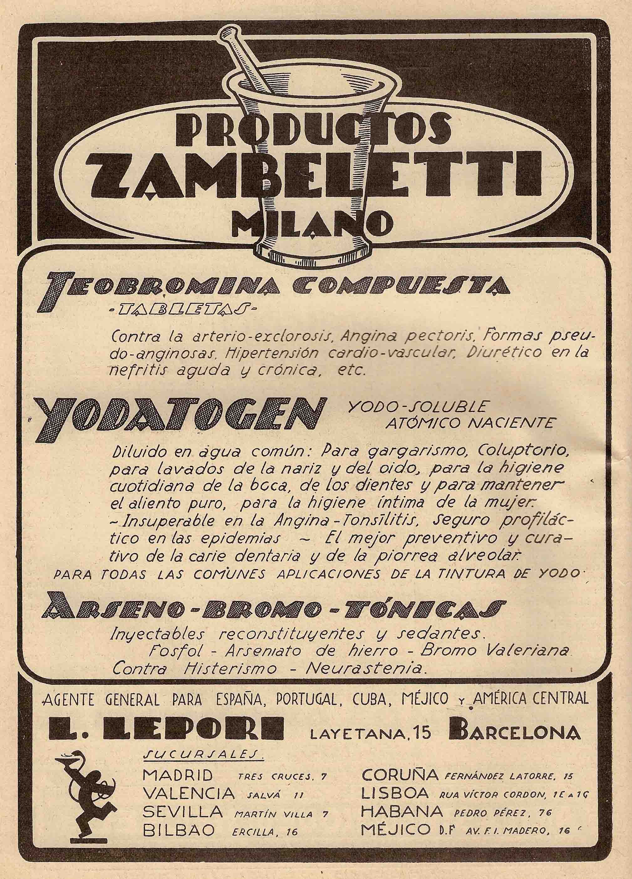 Yodatogen. Tabletas de teobromina compuesta. Indicada en arterio-esclerosis, angina pectoris, hipertension cardio-vascular. Productos Zambeletti. L. Lepori. Barcelona. La Medicina Íbera, 11 de abril de 1931.